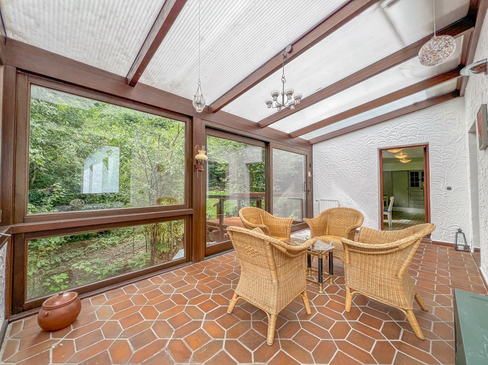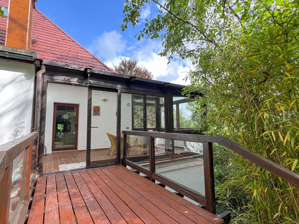 Das geräumige Schlafzimmer mit einem großen Einbauschrank, das Tageslichtbad, die schöne Küche mit Blick ins Grüne und einem Ausgang zum Wintergarten und der großzügige Wohnraum mit dem tollen Kamin, einer urgemütlichen Leseecke und einem weiteren Ausgang zum beheizbaren Wintergarten. Vom Wintergarten aus gelangt man über einen Holzsteg in den Garten.