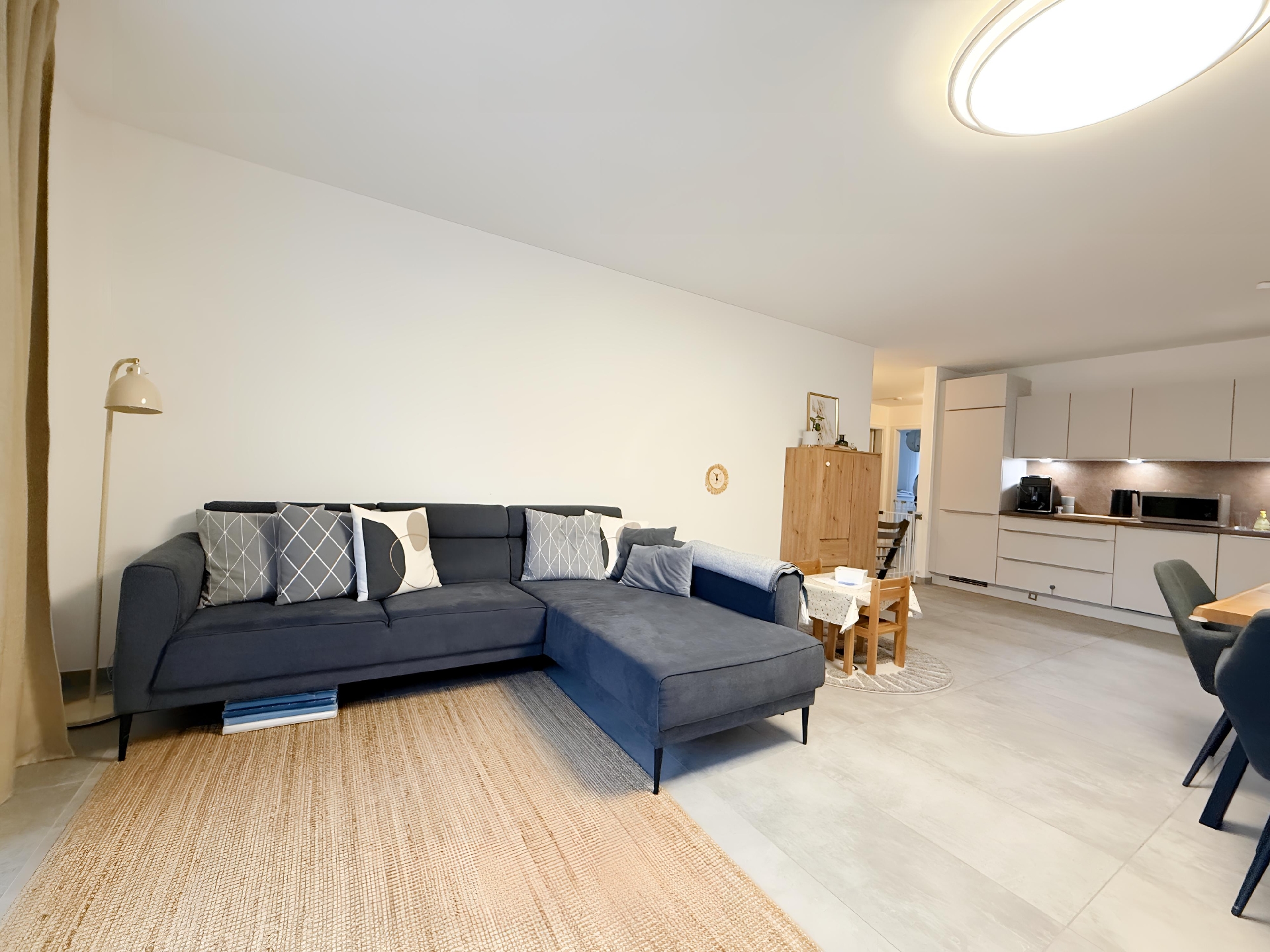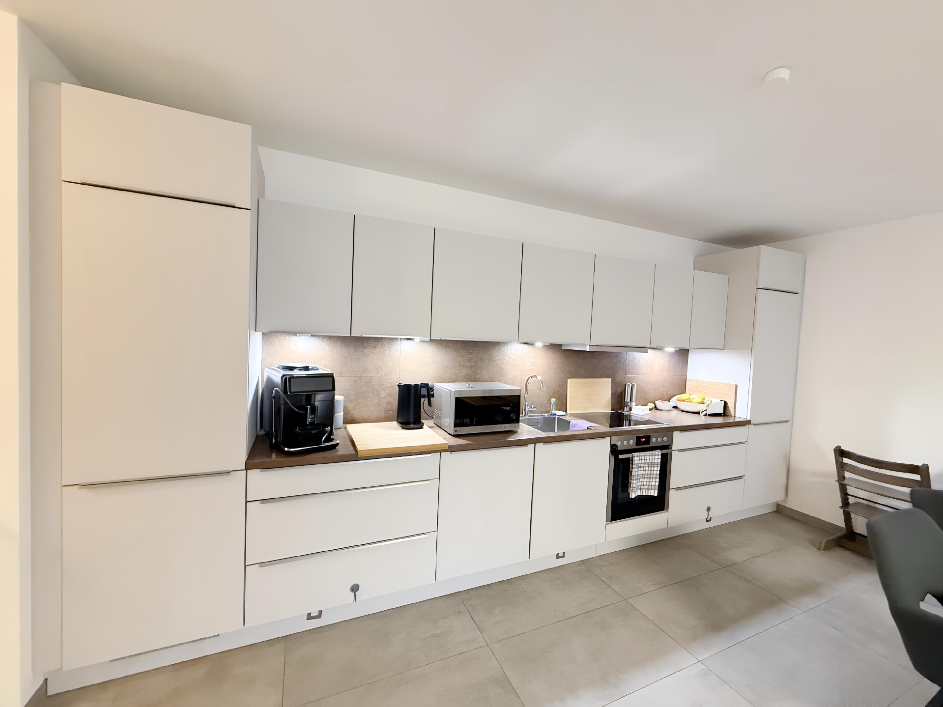 Diese moderne 3-Zimmer-Erdgeschosswohnung aus dem Baujahr 2019 überzeugt mit einem großzügigen, lichtdurchfluteten Wohn-/Essbereich mit Platz für eine offene Küche, zwei gut geschnittenen Schlafzimmern sowie einem stilvollen Bad mit bodengleicher Dusche und Wanne; ein separates Gäste-WC rundet den Grundriss ab. Große Fensterfronten, großformatige Feinsteinzeugfliesen und Fußbodenheizung schaffen ein angenehm zeitgemäßes Wohnambiente. Vom Wohnbereich geht es direkt auf die weitläufige Terrasse mit angrenzender Rasenfläche  ideal für den ersten Kaffee am Morgen oder entspannte Abende im Freien. Vor dem Einzug werden alle Wände frisch weiß gestrichen, die vorhandene Einbauküche verbleibt nicht, sodass Sie Ihre eigene Küchenplanung frei umsetzen können. Praktisch sind die zur Wohnung gehörende Garage und der zusätzliche Abstellraum im Dachgeschoss. Insgesamt präsentiert sich die Wohnung in sehr gepflegtem, nahezu neuwertigem Zustand  perfekt für Singles, Paare oder die kleine Familie, die ebenerdiges Wohnen mit hochwertigen Details und schönen Außenflächen schätzen.