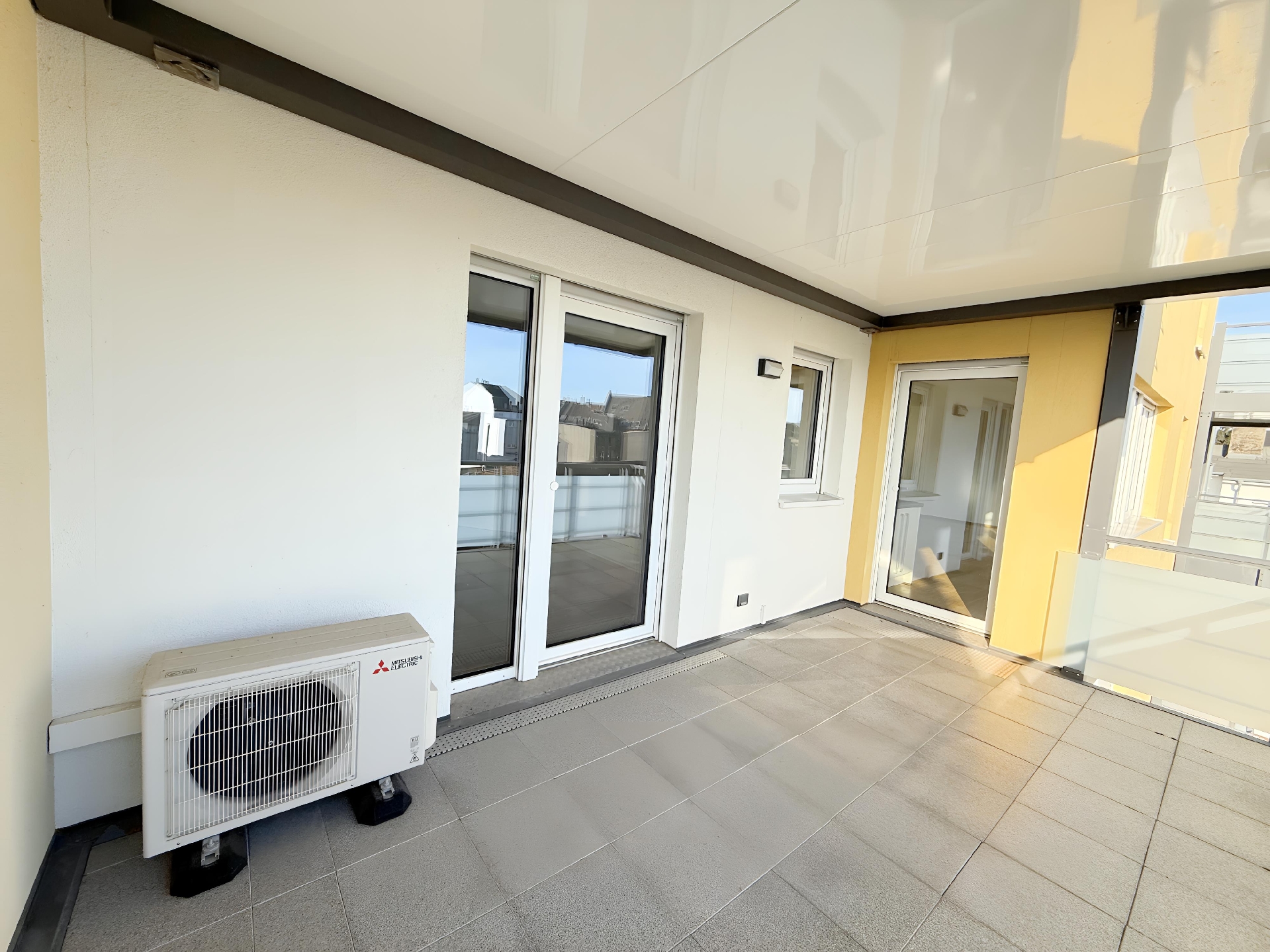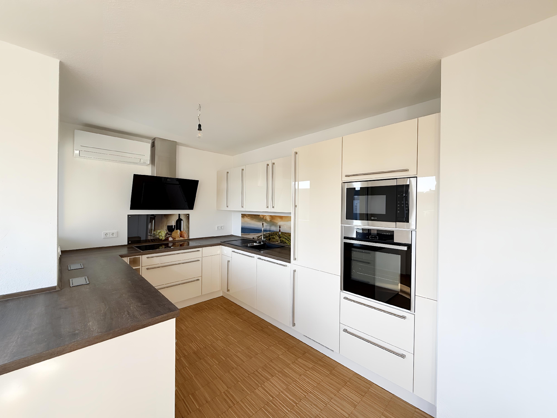 Der offene Wohn- und Essbereich mit großen Fensterflächen bildet das Herz der Wohnung. Hier sorgt der hochwertige Parkettboden für Wärme und Eleganz, während die offene Küche das moderne Wohnkonzept ideal ergänzt. Das Schlafzimmer dient als ruhiger Rückzugsort mit direktem Balkonzugang und eingebauter Klimaanlage. Zwei weitere Zimmer bieten vielfältige Nutzungsmöglichkeiten ob als Kinderzimmer, Gästezimmer oder Homeoffice.