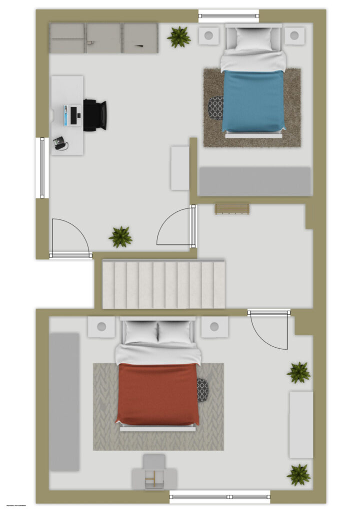 Im Obergeschoss erwarten Sie zwei behagliche Zimmer: Ein ruhiges Schlafzimmer schenkt erholsame Nächte, während das zweite Zimmer flexibel als Kinderzimmer, Büro oder Gästezimmer genutzt werden kann – ein Raum, der sich Ihren Bedürfnissen anpasst.