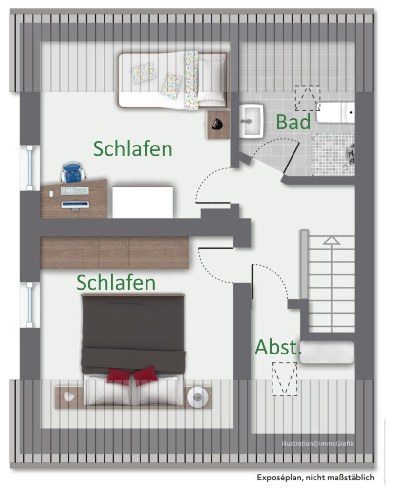 Über eine stilvolle Holztreppe mit gedrechseltem Geländer und Laminatstufen gelangt man durch eine Schiebetür in die zweite Wohneinheit, die sich mit ca. 83 m² Wohnfläche über das 1. und 2. Obergeschoss erstreckt. Im 1. Obergeschoss befindet sich die helle Wohnküche mit direktem Zugang zur Dachterrasse – einem besonderen Highlight des Hauses. Mit ihrer ruhigen süd-west Lage und dem Blick ins Grüne lädt sie zum Verweilen ein. Vom Küchenbereich aus sind zudem das Esszimmer und das angrenzende Wohnzimmer bequem erreichbar. Im Dachgeschoss befinden sich zwei Schlafzimmer sowie ein Duschbad mit Tageslicht.