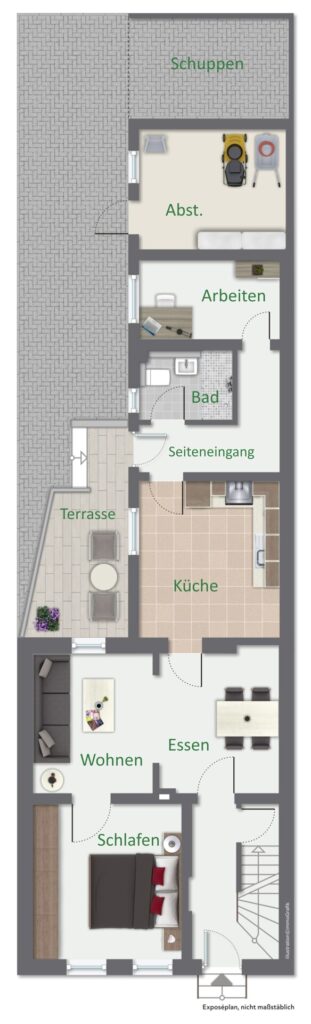 Die Erdgeschosswohnung verfügt über eine Wohnfläche von ca. 77 m² und umfasst ein gemütliches Wohn- und Esszimmer mit direktem Zugang zur großzügigen Wohnküche, ein Schlafzimmer sowie ein weiteres kleines Zimmer, das flexibel als Kinder-, Arbeits- oder Gästezimmer genutzt werden kann. Ein praktisches Tageslichtbad mit Dusche rundet das Raumangebot ab. Der Zugang erfolgt entweder über den gemeinsamen Hauseingang an der Straßenseite oder über einen separaten Eingang vom Hof aus. Dort befindet sich auch die sonnige Terrasse mit Blick ins Grüne – ein schöner Rückzugsort für entspannte Stunden im Freien.