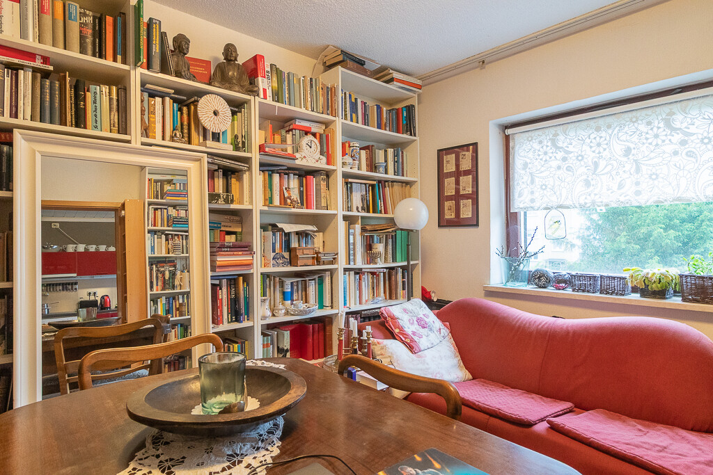 Über eine stilvolle Holztreppe mit gedrechseltem Geländer und Laminatstufen gelangt man durch eine Schiebetür in die zweite Wohneinheit, die sich mit ca. 83 m² Wohnfläche über das 1. und 2. Obergeschoss erstreckt. Im 1. Obergeschoss befindet sich die helle Wohnküche mit direktem Zugang zur Dachterrasse – einem besonderen Highlight des Hauses. Mit ihrer ruhigen süd-west Lage und dem Blick ins Grüne lädt sie zum Verweilen ein. Vom Küchenbereich aus sind zudem das Esszimmer und das angrenzende Wohnzimmer bequem erreichbar. Im Dachgeschoss befinden sich zwei Schlafzimmer sowie ein Duschbad mit Tageslicht.