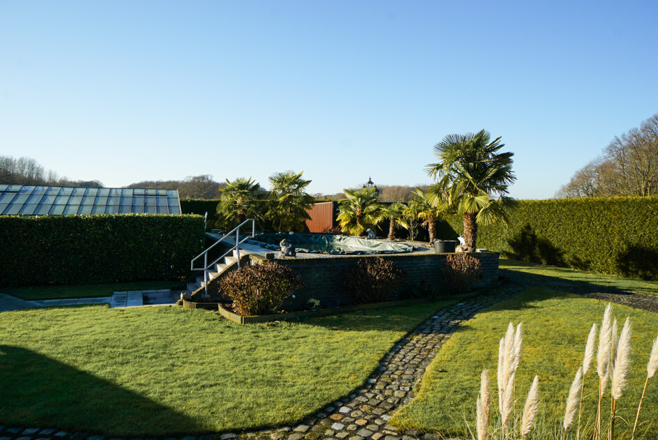 Das Highlight des Anwesens ist zweifellos der großzügig angelegte Garten, ein Paradies für Gartenliebhaber. Hier finden Sie einen schön gestalteten Wintergarten, einen erfrischenden Pool sowie ein praktisches Gewächshaus. Der große Teich und die hohe Hecke, die das Grundstück umgibt, sorgen für eine private und ruhige Umgebung.