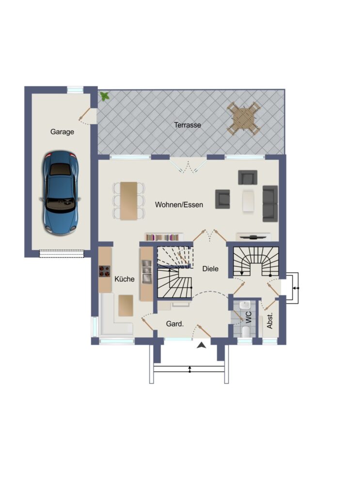 Das Erdgeschoss bietet eine zum Wohn- und Esszimmer hin offene, moderne Einbauküche sowie zwei Abstellräume und ein schönes Gäste-WC.