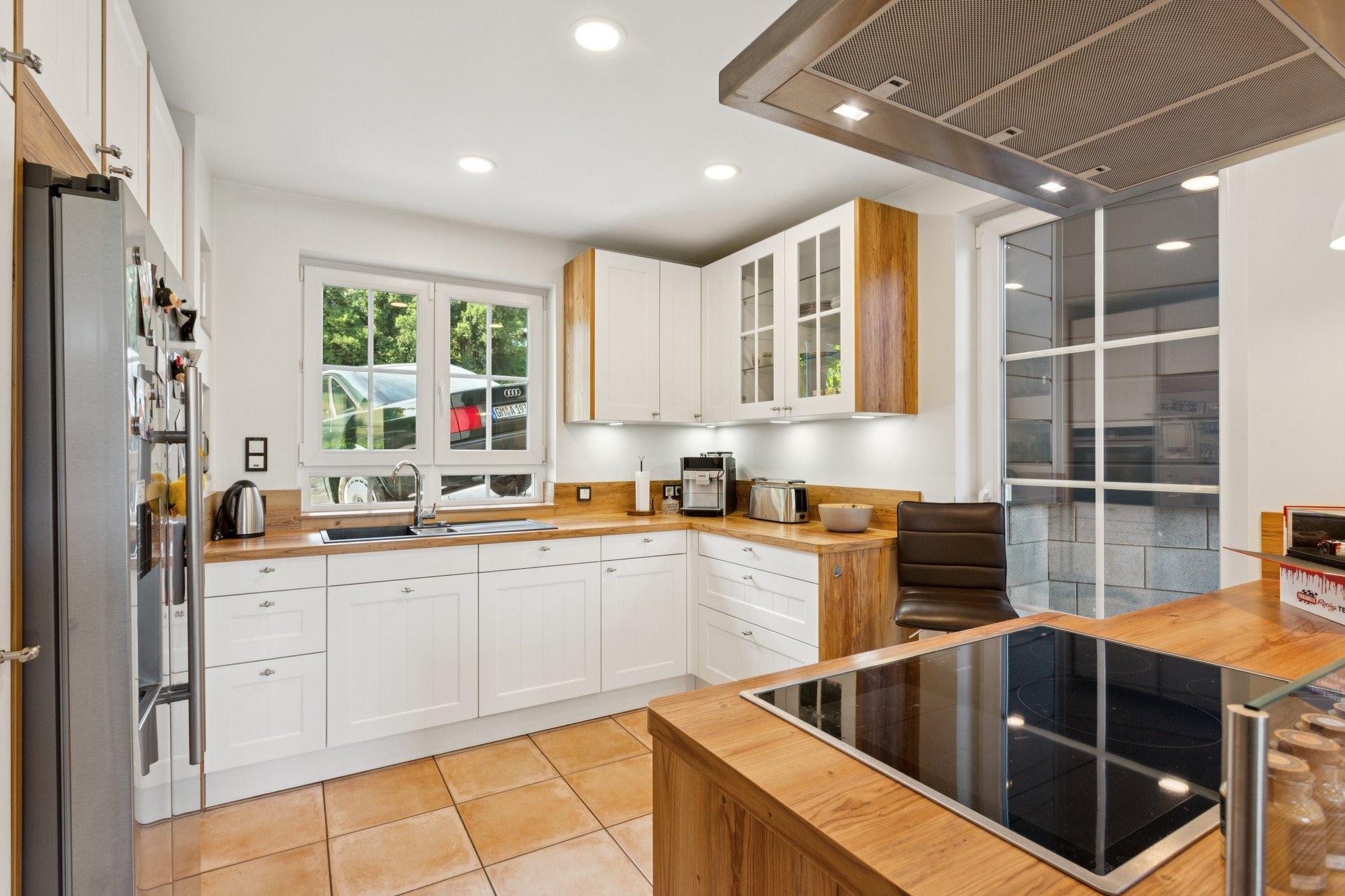 Die geräumige Küche mit moderner Induktionskochinsel lässt keine Wünsche offen und bietet ausreichend Platz für einen großen Esstisch.