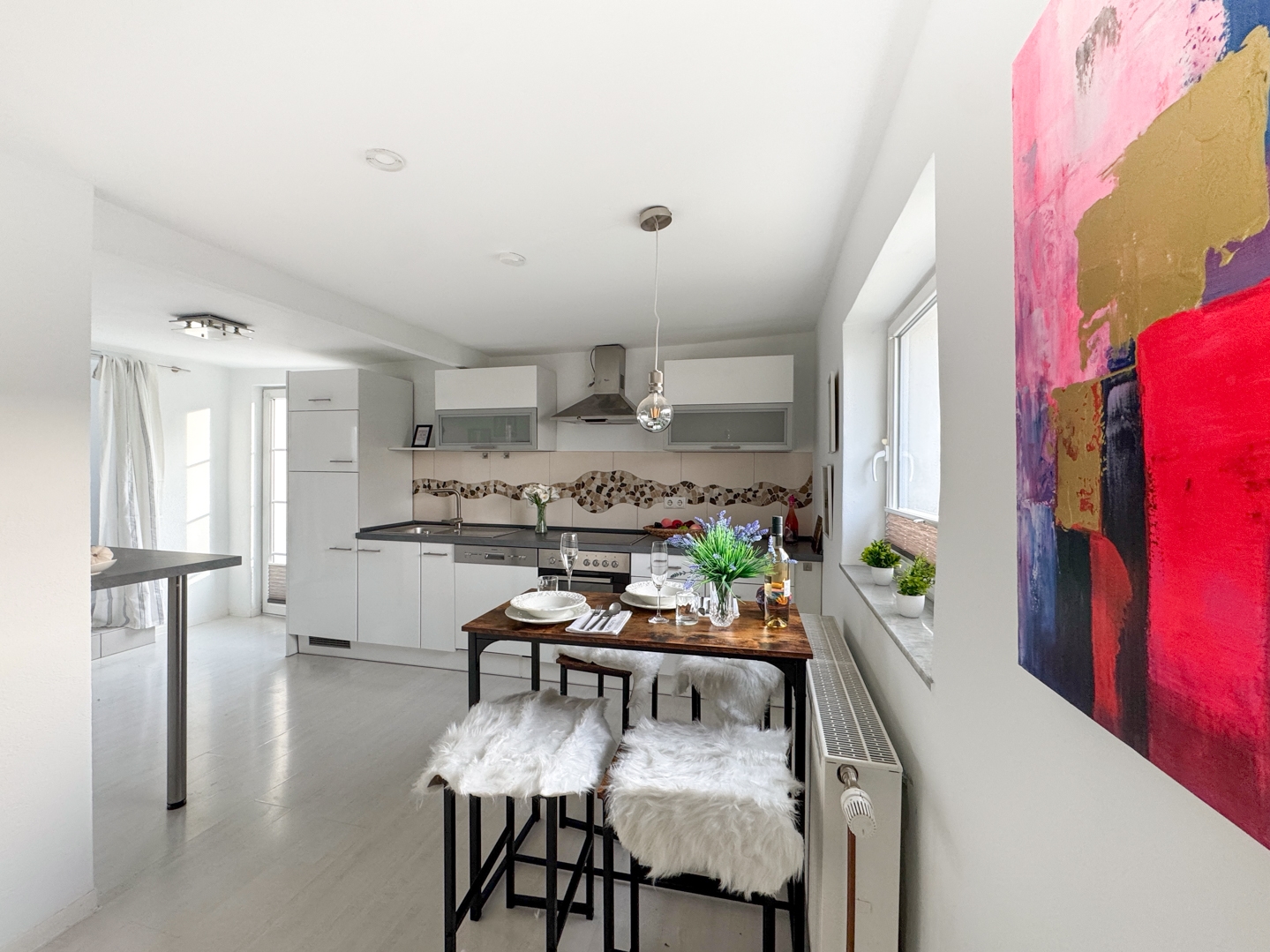 Die Küche, die mit einer Einbauküche ausgestattet ist, bietet genügend Platz für einen Esstisch. Die
