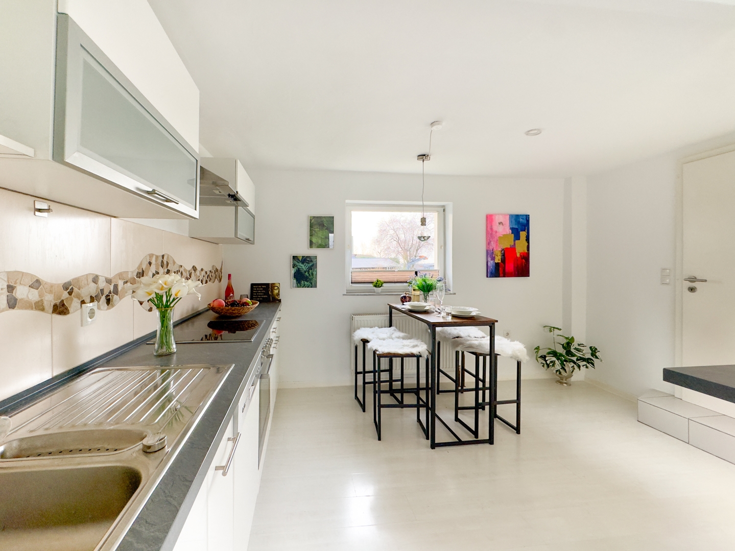 hellen Farben verleihen dem Raum eine freundliche Offenheit. Angrenzend befindet sich ein Abstellraum mit Platz für Waschmaschine, Trockner oder Vorräte. Hier ist auch die moderne Heizanlage untergebracht.