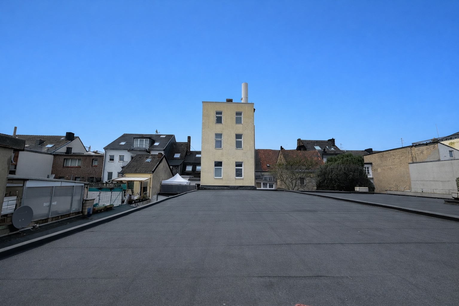 Auf dem Wohn- und Geschäftshaus ist eine Mobilfunkantenne installiert.