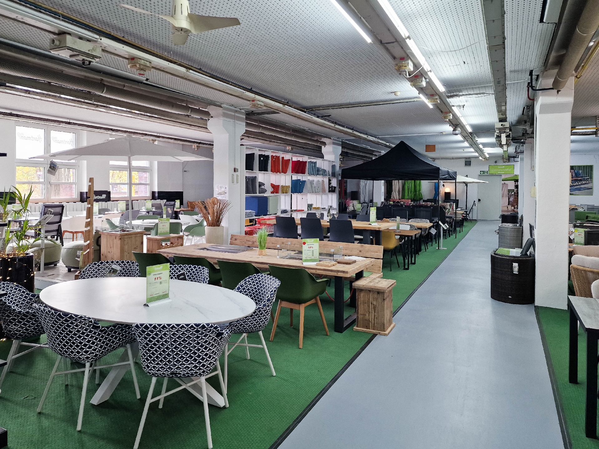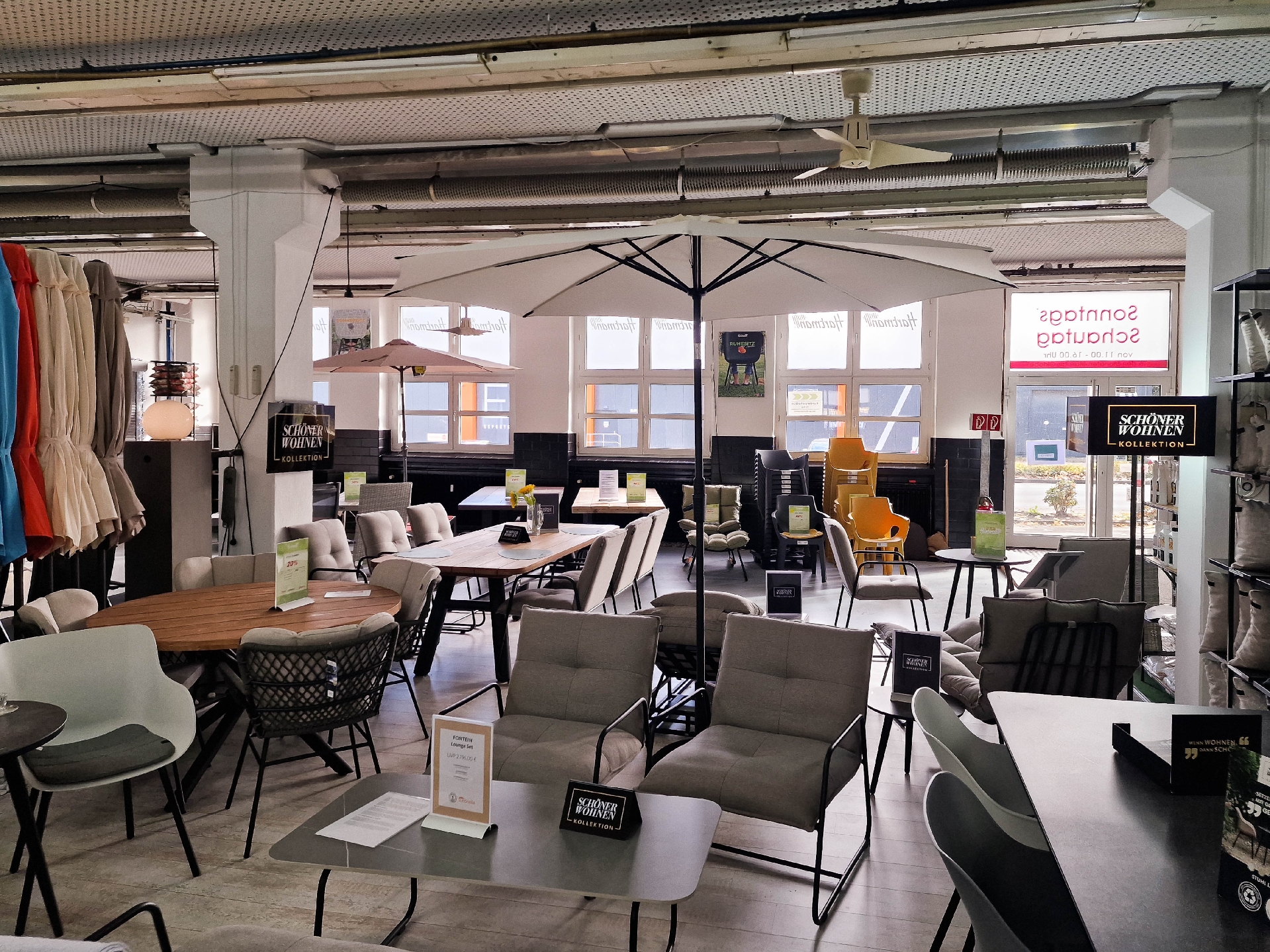 Das Objekt wird heute als Verwaltung und zum Verkauf von Gartenmöbeln genutzt. Die Verkaufsfläche ist 983 m² groß und verfügt über eine Höhe bis zur abgehangenen Decke von 3,50m. Hier lassen sich Ihre Waren perfekt präsentieren. Die Fläche kann natürlich auch als Produktionsfläche genutzt werden. Bestückt wird die Halle über eine Lieferrampe. Zusätzlich gibt es einen Eingang zur Verwaltung und einen getrennten Eingang in die Verkaufsfläche. Die anschließenden 233 m² Bürofläche runden das Gesamtangebot dieser Immobilie ab. Diese sind ebenfalls sehr modern und hell gestaltet und verfügen über heutige Technikstandards.