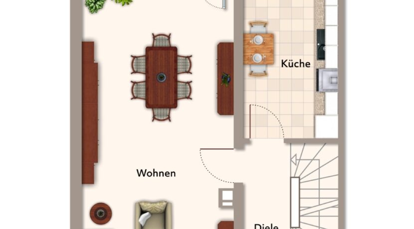 Beim Betreten des Hauses empfängt Sie ein heller Eingangsbereich mit einem praktischen Gäste-WC. Die Küche bietet ausreichend Platz für kulinarische Entfaltung und ist direkt mit dem großzügigen Wohn- und Esszimmer verbunden. Große Fenster sorgen für viel Tageslicht und schaffen eine freundliche Atmosphäre. Von hier aus gelangen Sie direkt auf die Terrasse mit Markise und Windschutz – ein idealer Ort für entspannte Stunden im Freien.