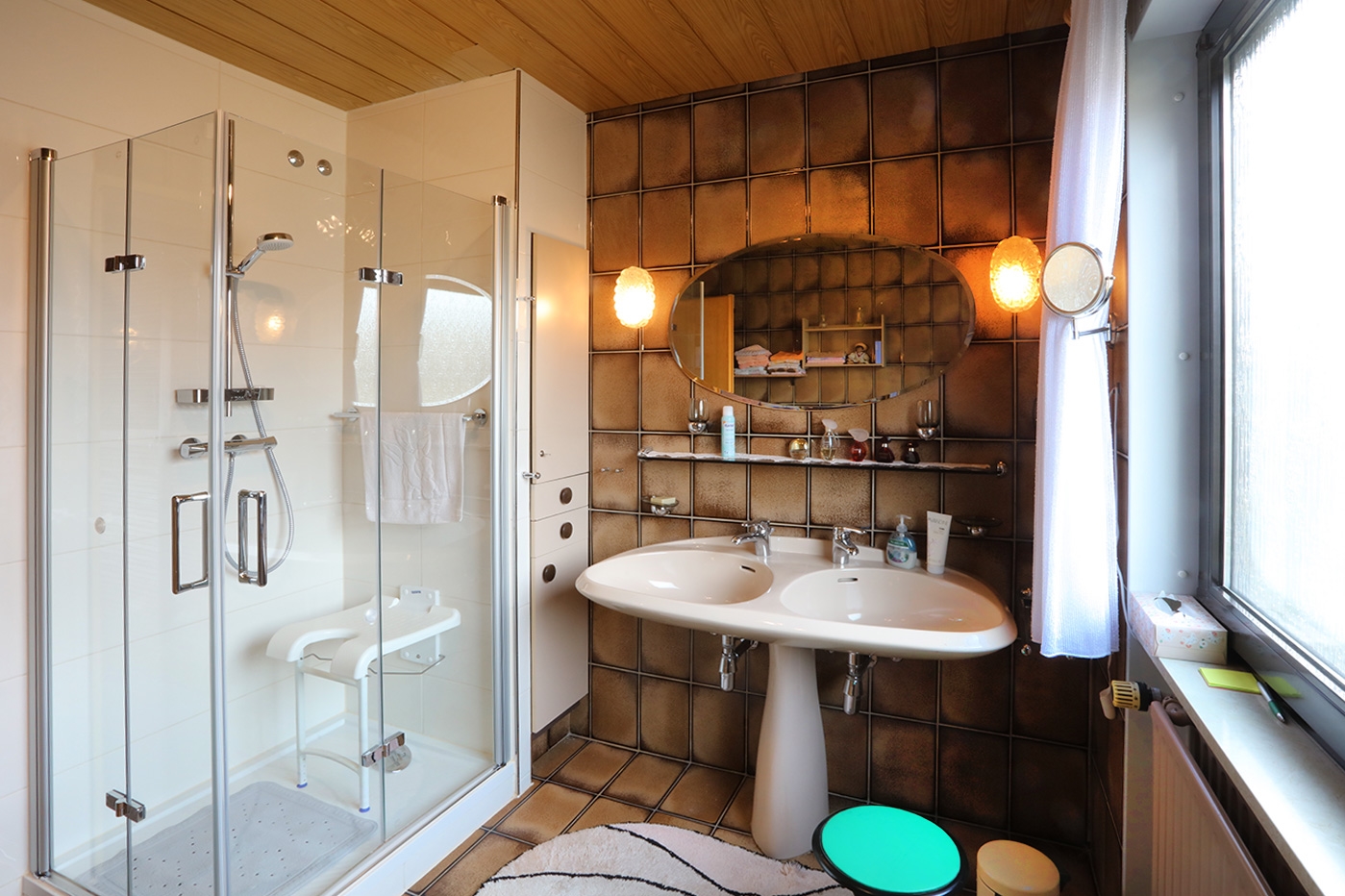 - Badausstattung: Dusche, Badewanne, Fenster im Badezimmer