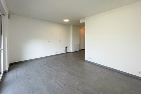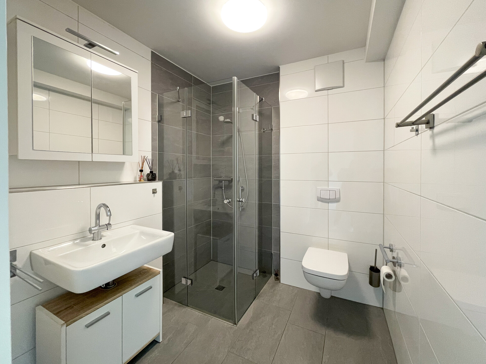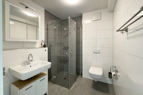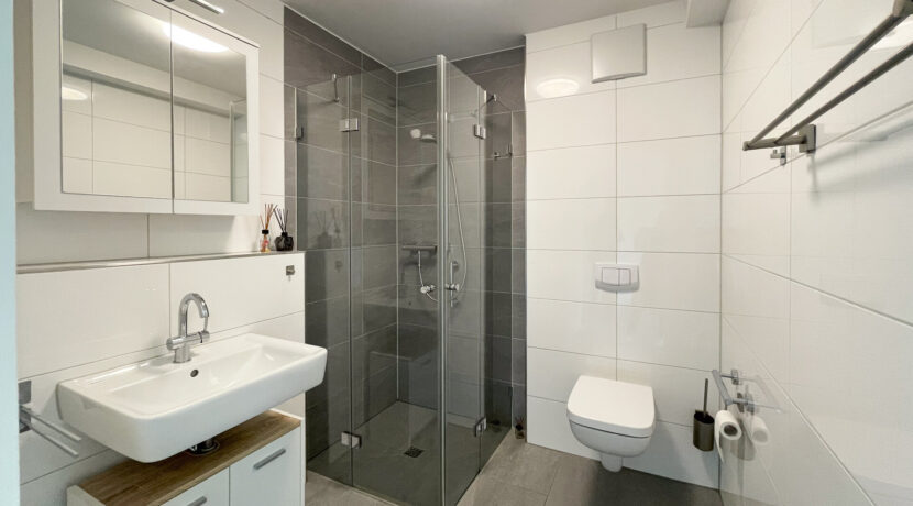 Das geräumige Badezimmer ist mit einer ebenerdigen Dusche ausgestattet und vollständig barrierefrei gestaltet. Hochwertige, pflegeleichte graue Fliesen wurden in der gesamten Wohnung verlegt und unterstreichen den modernen Charakter des Apartments.