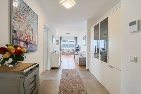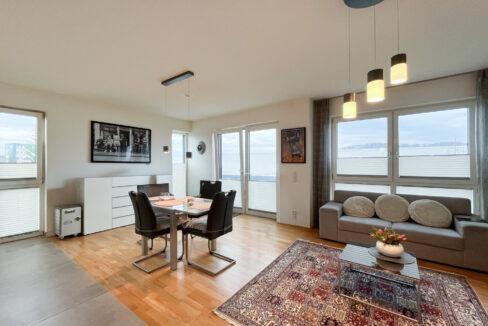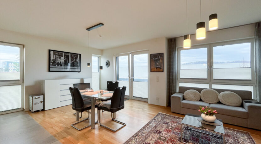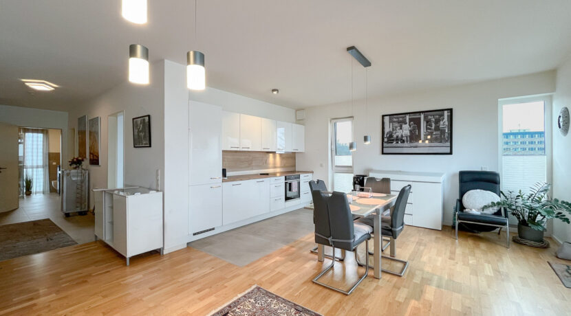 Der offene Wohn- und Essbereich mit integrierter Küche ist das Herzstück der Wohnung. Hier entsteht ein lichtdurchflutetes, großzügiges Wohngefühl, das ausreichend Raum für eine gemütliche Sofalandschaft sowie einen großen Esstisch für gesellige Abende mit Familie und Freunden bietet.