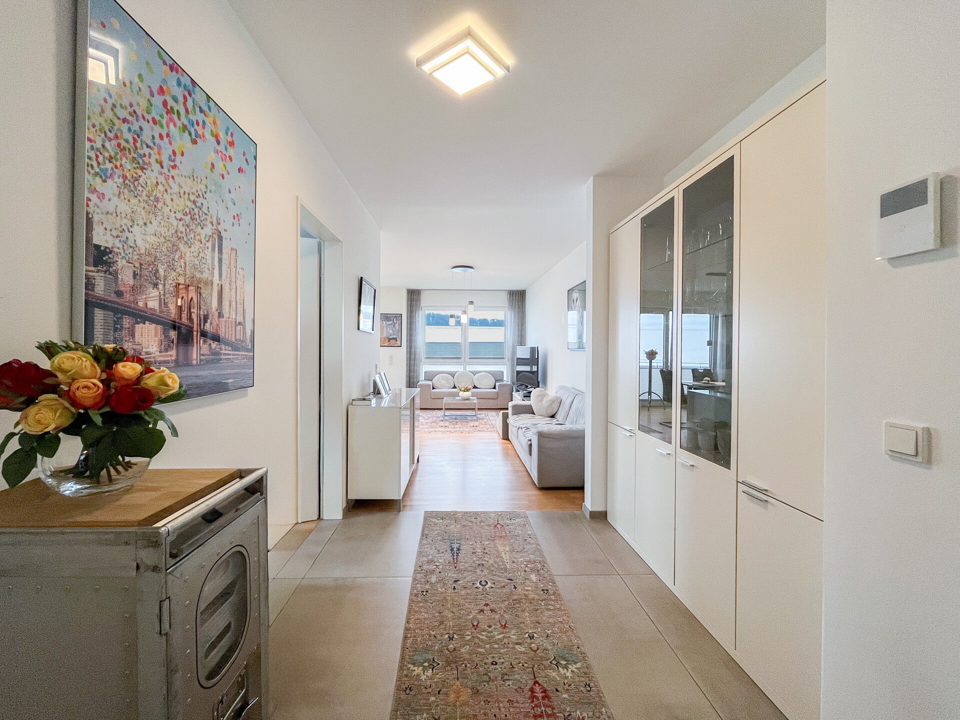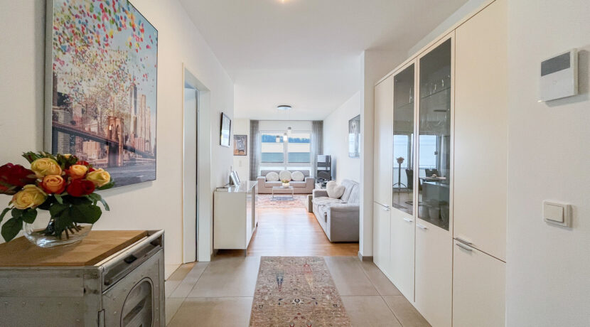 In Küche, Flur und Badezimmer sind moderne Fliesen verlegt, während Wohn- und Schlafräume mit hochwertigem Parkettboden ausgestattet sind. Die Wohnung verfügt über elektrische Rollläden und eine Gas-Zentralheizung mit Warmwasser, unterstützt durch eine Solaranlage. Die Fußbodenheizung lässt sich über separate Raumthermostate individuell steuern.