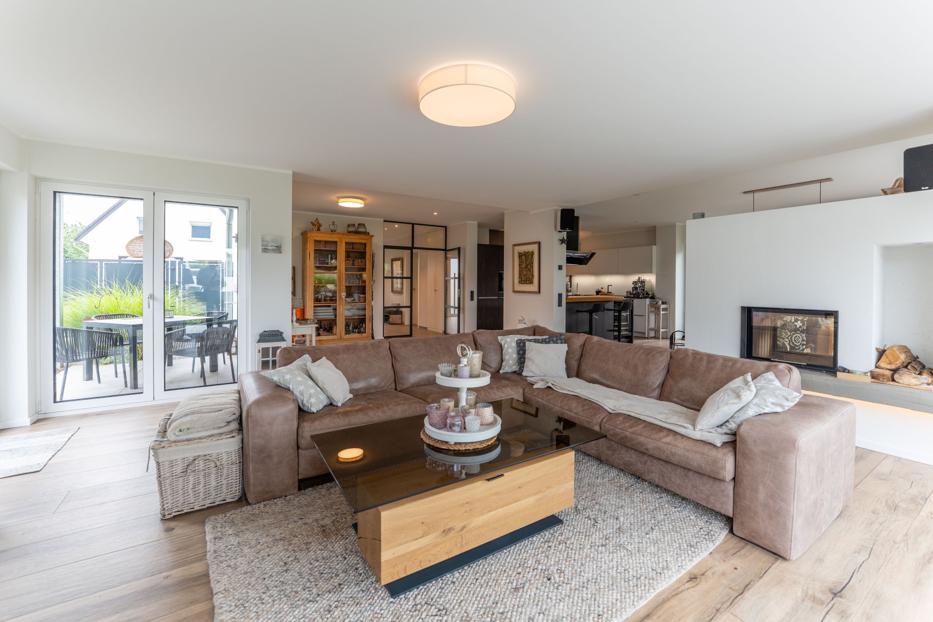 Das Herzstück des Hauses bildet der offene, beeindruckende Wohn- und Essbereich mit einer modernen offenen Küche und Kamin. Große Fenster sorgen für viel Tageslicht und ermöglichen den Zugang zu zwei Terrassen sowie dem sehr gepflegten Garten, der mit einem Gartenhaus zum Entspannen und Verweilen einlädt.