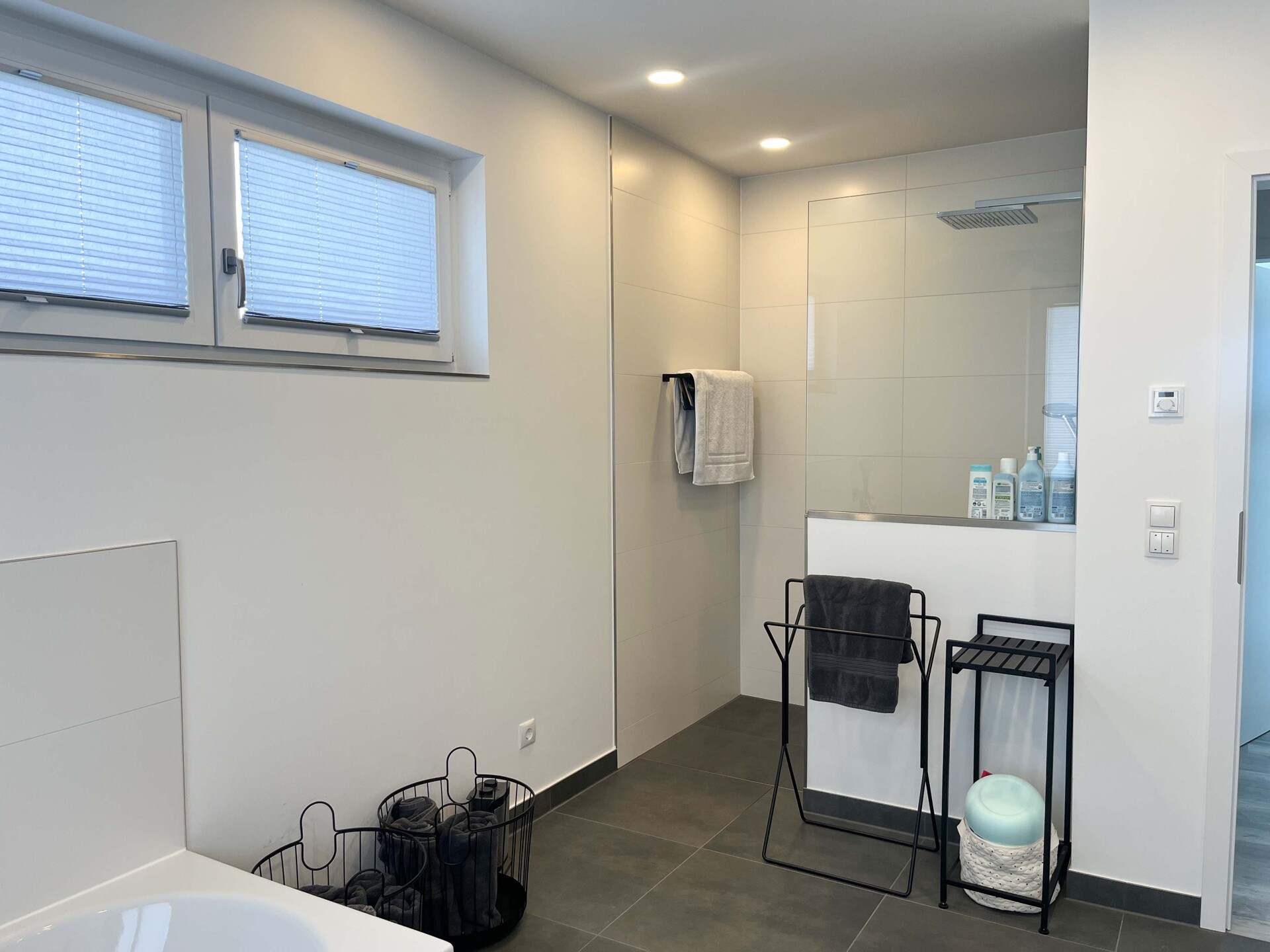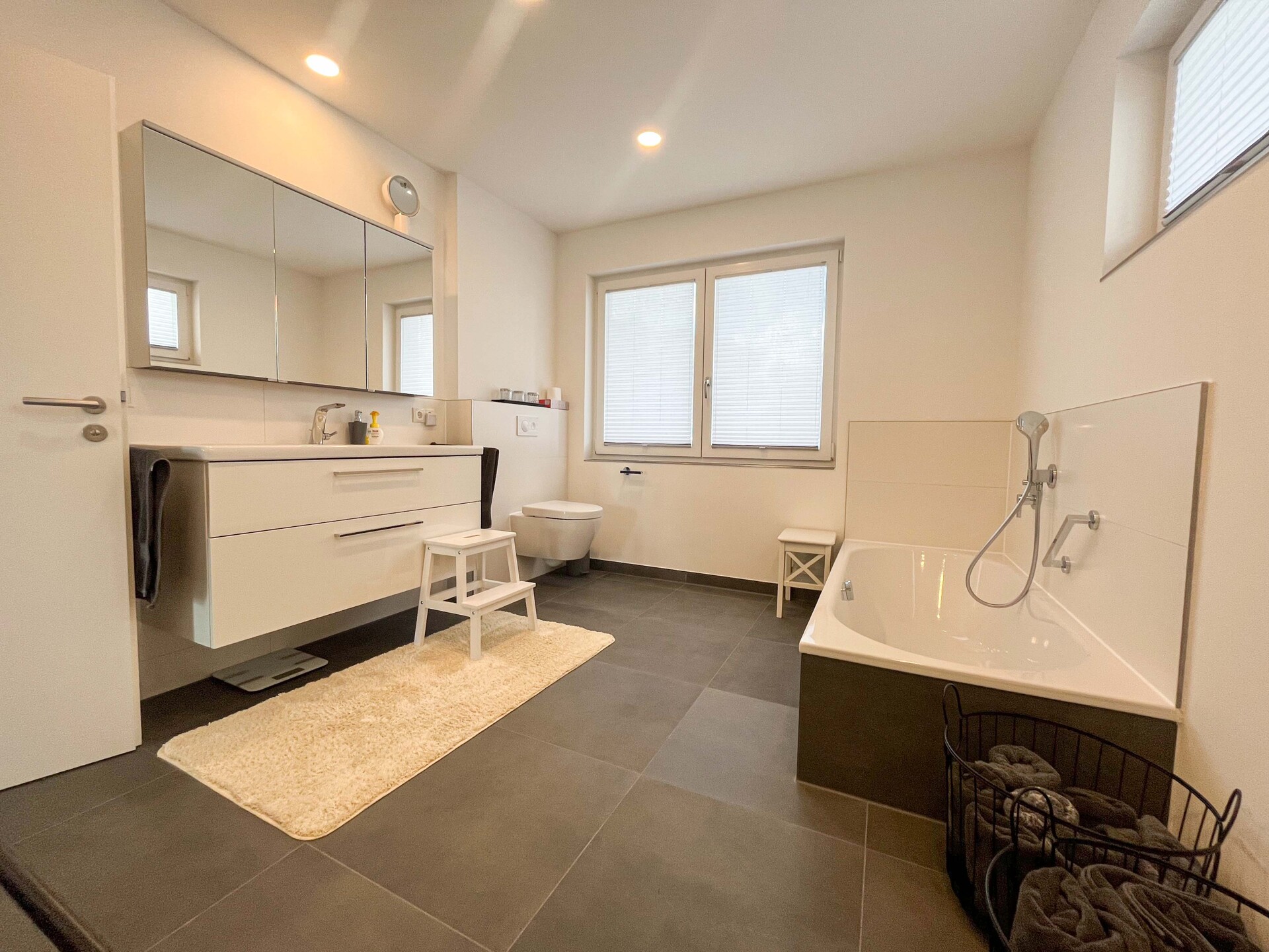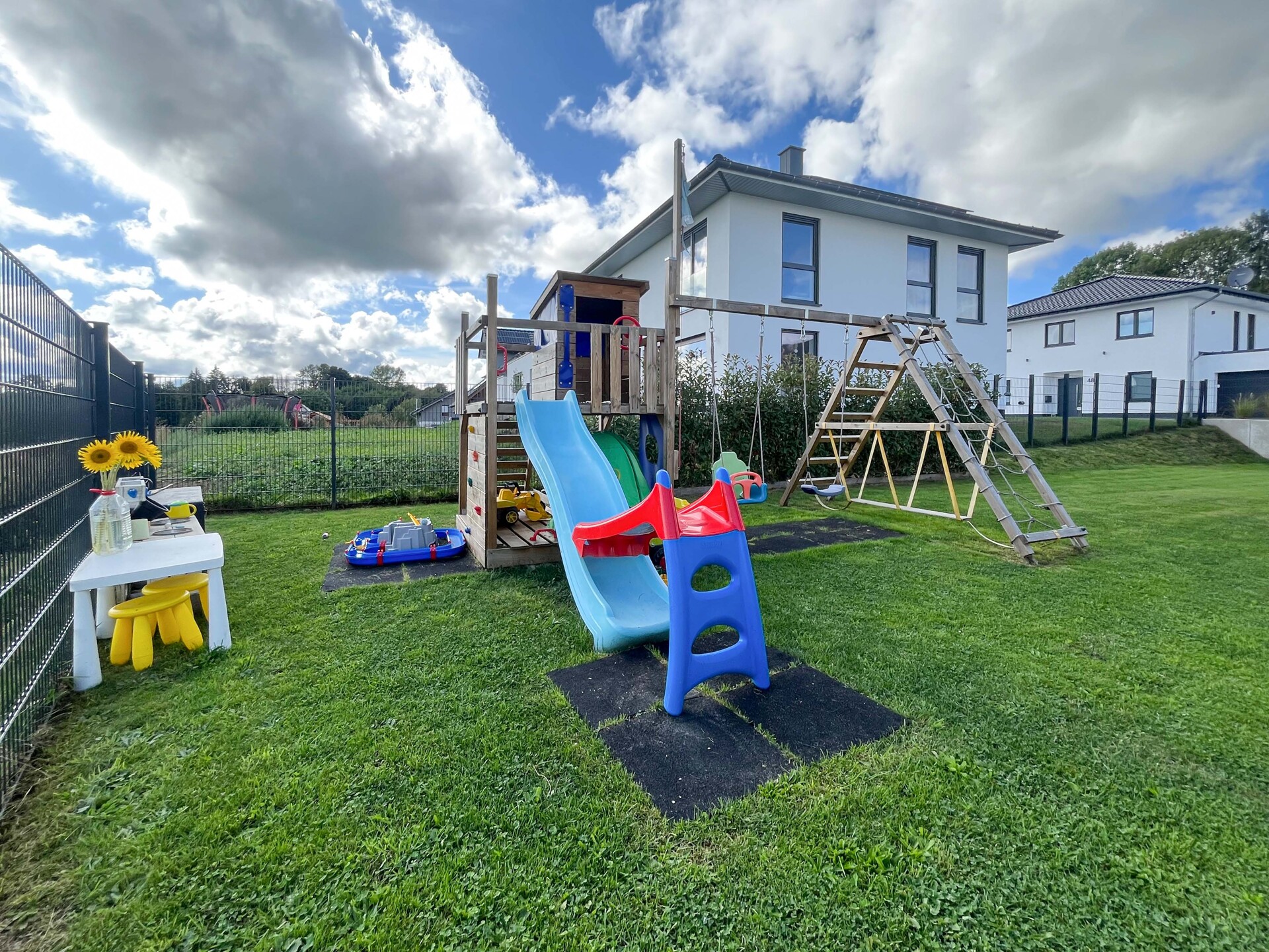 Das großzügige Erdgeschoss besticht durch einen offenen Wohn- und Essbereich mit integrierter Küche, der direkten Zugang zur Terrasse und zum weitläufigen Garten ermöglicht. Ergänzt wird das Raumangebot hier durch ein helles Büro, ein Gäste-WC mit Dusche, eine praktische Abstellkammer sowie den Heizungsraum mit moderner Wärmepumpe. Im Obergeschoss erwarten Sie zwei Kinderzimmer, ein Schlafzimmer mit angrenzendem Ankleidezimmer, ein großzügiges Badezimmer mit Badewanne und Dusche sowie ein zusätzlicher Fitnessraum. Damit bietet das Haus ideale Voraussetzungen für Familien, die Wert auf Funktionalität und Komfort legen.
