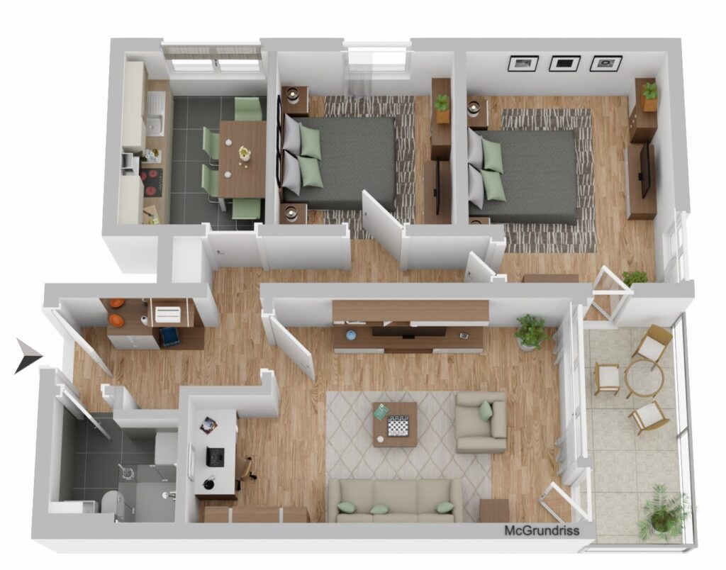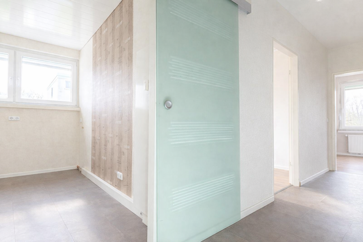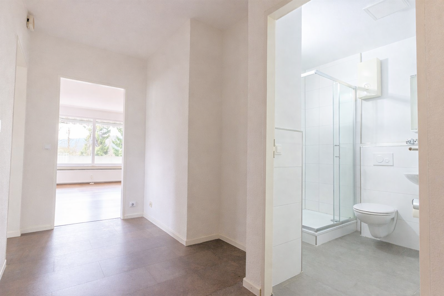 Beim Betreten der Wohnung gelangen Sie in eine Eingangsdiele mit Platz für eine Garderobe. Von hier aus erreichen Sie direkt das moderne Duschbad sowie das großzügige Wohn-/ und Esszimmer mit Zugang zur Loggia.