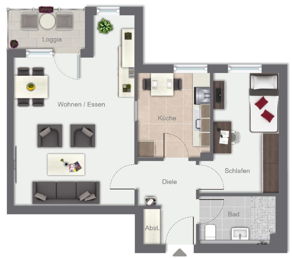Die Wohnung verfügt über eine Diele mit Einbauschrank, ein helles Wohn- und Esszimmer mit Zugang zur Loggia, ein separates Schlafzimmer, eine Küche (inkl. Anschluss für eine Waschmaschine) sowie ein barrierearmes Duschbad. Das Badezimmer ist mit einer ebenerdigen Dusche, Haltegriffen, Waschbecken und WC ausgestattet.