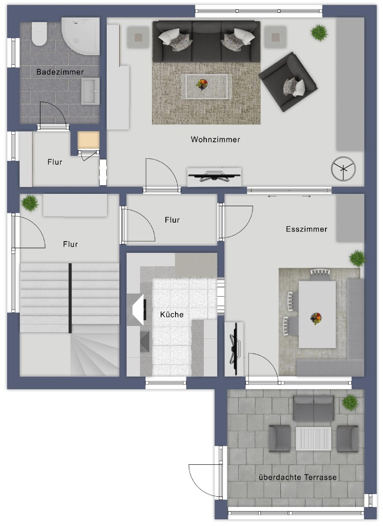 Sie betreten das Haus über ein separates Treppenhaus, das die einzelnen Etagen klar voneinander trennt. Die Diele bietet ausreichend Platz für eine Garderobe und erschließt die Räume dieser Etage. Von hier aus gelangen Sie zunächst in das großzügige Wohnzimmer. Ebenfalls von der Diele aus erreichbar ist das Esszimmer mit direkt anschließender Küche. Das Esszimmer bietet Zugang zur überdachten und vollständig geschlossenen Terrasse. Ergänzt wird das Erdgeschoss durch ein Duschbad mit Fenster.