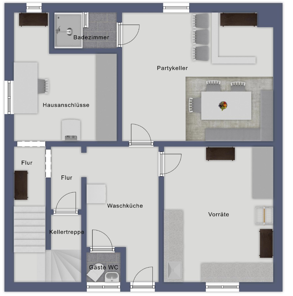 Das Kellergeschoss bietet großzügige zusätzliche Nutzflächen. Neben einem Vorratskeller und einem gemütlichen Partykeller stehen ein weiteres kleines Duschbad, eine Waschküche mit angrenzendem WC und direktem Gartenzugang sowie der Technikraum zur Verfügung.