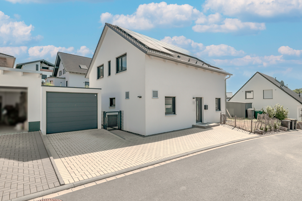 Dieses moderne Einfamilienhaus in Much-Marienfeld, errichtet im Jahr 2020 in hochwertiger Hansehaus-Holzständerbauweise, bietet auf rund 170 m² Wohnfläche ein lichtdurchflutetes und durchdachtes Zuhause für Familien. Das 467 m² große Grundstück mit Terrasse, gepflegtem Garten und modernem Gartenhaus schafft den idealen Raum für entspannte Stunden im Freien.
