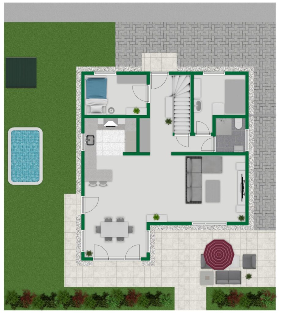 Die Ausstattung des Hauses ist auf Komfort und Energieeffizienz ausgelegt. Dreifach verglaste Fenster mit Fliegennetzen, elektrische Rollläden sowie eine zentrale Lüftungsanlage mit Wärmerückgewinnung garantieren ein gesundes Raumklima bei gleichzeitiger Vermeidung von Schimmel. Eine moderne Photovoltaikanlage mit Eigenverbrauch und Einspeisung sorgt für geringe Energiekosten, unterstützt von der hervorragenden Energieeffizienzklasse A (37 kWh/m²a). CAT-7-Verkabelung und zahlreiche Steckdosen machen das Haus auch technisch zukunftssicher. Eine Garage in Überlänge mit elektrischem Tor und angrenzendem Abstellraum dient als praktischer Kellerersatz.