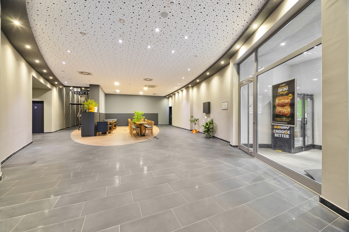 Im rechten Bereich des Erdgeschosses befinden sich zwei gastronomische Einheiten. Ein etabliertes indisches Restaurant überzeugt durch einen hochwertigen Innenausbau mit modernem Farb- und Lichtkonzept, großzügigem Gastraum, stilvollen Sitznischen sowie einem professionell ausgestatteten Küchenbereich mit entsprechender Ablufttechnik. Die Gestaltung wirkt modern, einladend und stark frequenzorientiert. Ergänzt wird das Erdgeschoss durch ein bekanntes Fast-Food-Restaurant der Systemgastronomie. Die Einheit präsentiert sich hell, freundlich und funktional strukturiert. Ein großzügiger Gastraum mit variabler Bestuhlung, moderner Tresen- und Kassenbereich sowie eine zeitgemäße technische Ausstattung unterstreichen den professionellen Auftritt. Beide gastronomischen Betriebe profitieren von der Synergie mit der Spielothek sowie der hohen Besucherfrequenz des Gesamtobjektes.