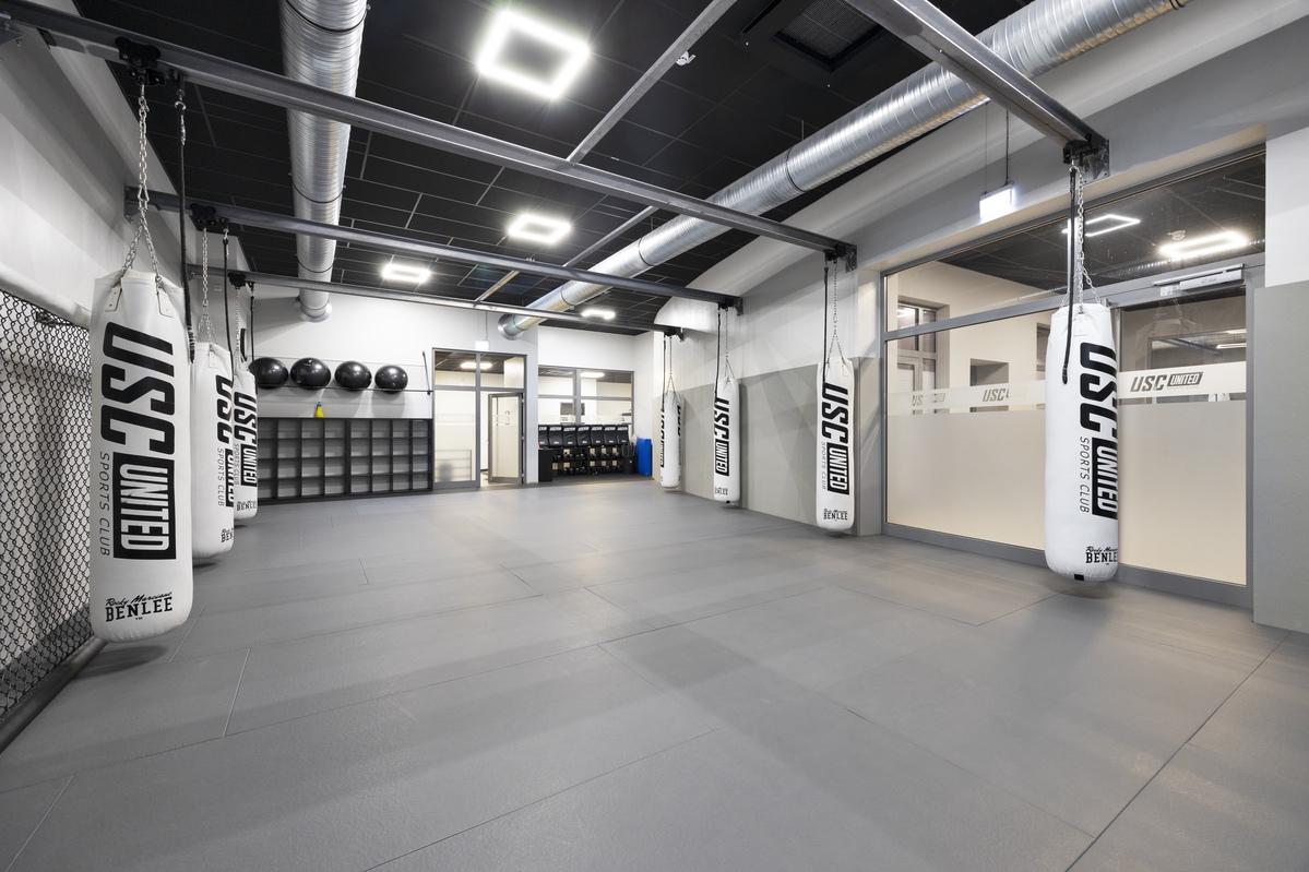 Im 1. Obergeschoss befindet sich auf der linken Seite ein modern ausgestatteter Boxclub bzw. ein Fitness- und Functional-Training-Studio. Die Fläche überzeugt durch ein offenes, urbanes Raumkonzept mit hochwertigem Bodenbelag, professionellen Trainingsgeräten, Freihantelbereich sowie großzügigen Trainingszonen. Spiegelwände, moderne Lichtinstallationen und sichtbare Lüftungselemente unterstreichen den zeitgemäßen Charakter. Ergänzt wird die Einheit durch moderne Umkleide- und Duschbereiche sowie separate Regenerations- und Ruheräume.