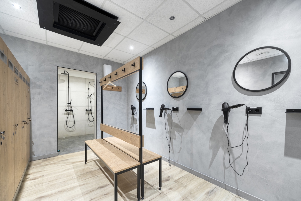 Auf der rechten Seite des 1. Obergeschosses befindet sich ein EMS-Studio mit hochwertigem Innenausbau. Die Fläche ist klar strukturiert und funktional gestaltet. Moderne Trainingsbereiche, Spiegelwände, dezente Beleuchtung sowie gepflegte Umkleide- und Sanitärbereiche vermitteln einen professionellen Gesamteindruck. Das Studio ergänzt das Fitnessangebot ideal und sorgt für eine zusätzliche, zielgruppenspezifische Frequenz.