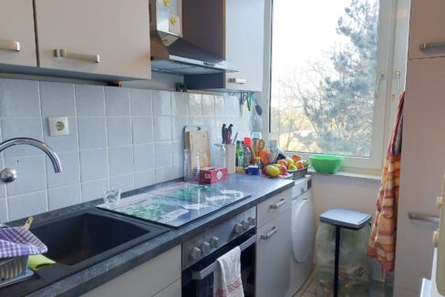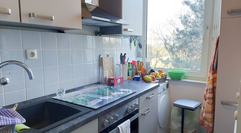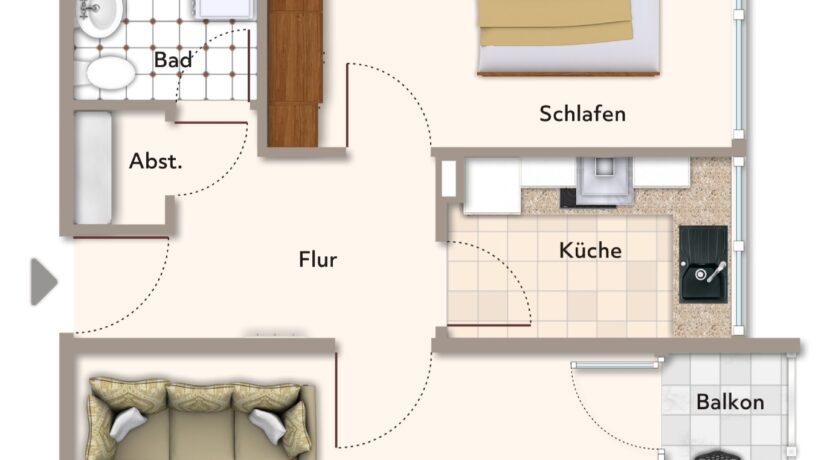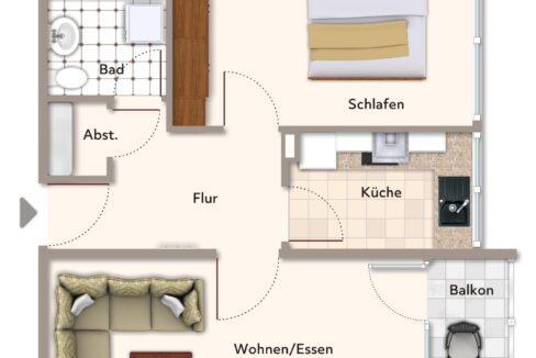 Die Wohnung ist klassisch geschnitten mit Flur, einem Schlafzimmer, Bad mit Duschwanne, Wohn-Esszimmer, separater Küche und – nicht zu verachten- einem Abstellraum.