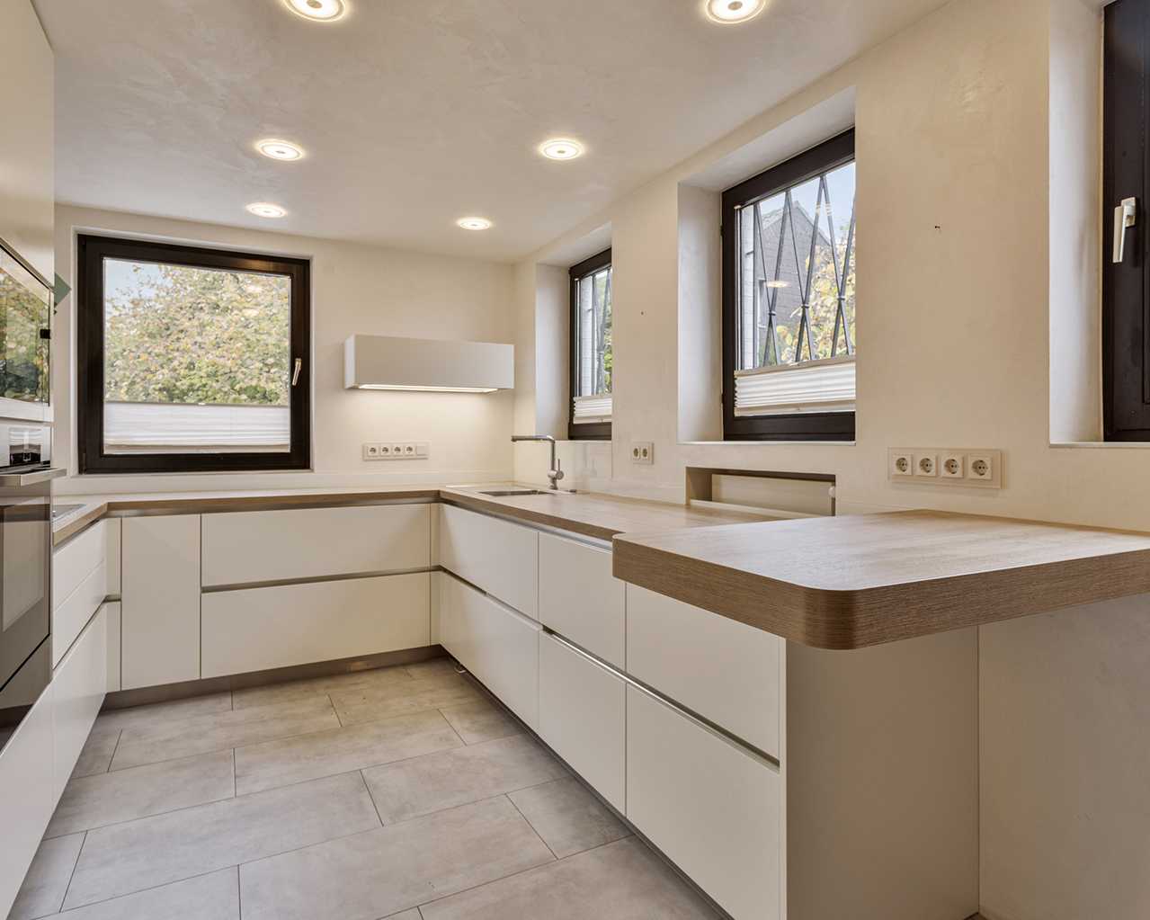 Das Erdgeschoss bietet einen großzügigen Wohn-/Essbereich mit ca. 75 m². Die sieben Meter breite Fensterfront bietet einen fantastischen Blick in den sehr weitläufigen Garten, der eine beeindruckende Größe aufweist. Im Erdgeschoss befindet sich ebenfalls die moderne, hochwertige Küche mit vier Fenstern und Blick in den Vorgarten. Die Diele ist offen gestaltet und bietet ausreichend Platz für die Garderobe. Das Gäste-WC mit vorgelagertem Garderobenraum ergänzt den Empfangsbereich.