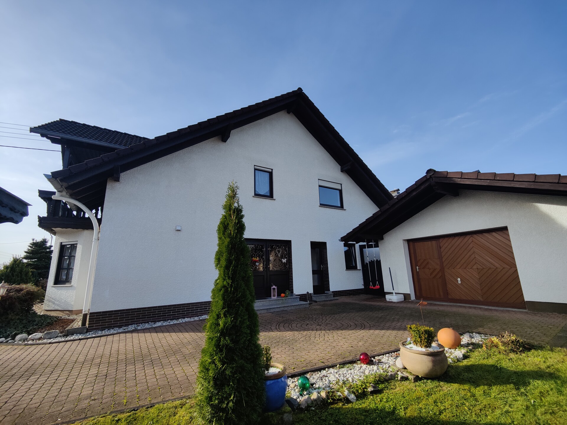 Über eine gemeinsame Zufahrt mit dem Nachbarhaus gelangt man zum Haupthaus sowie zu den beiden Garagen.