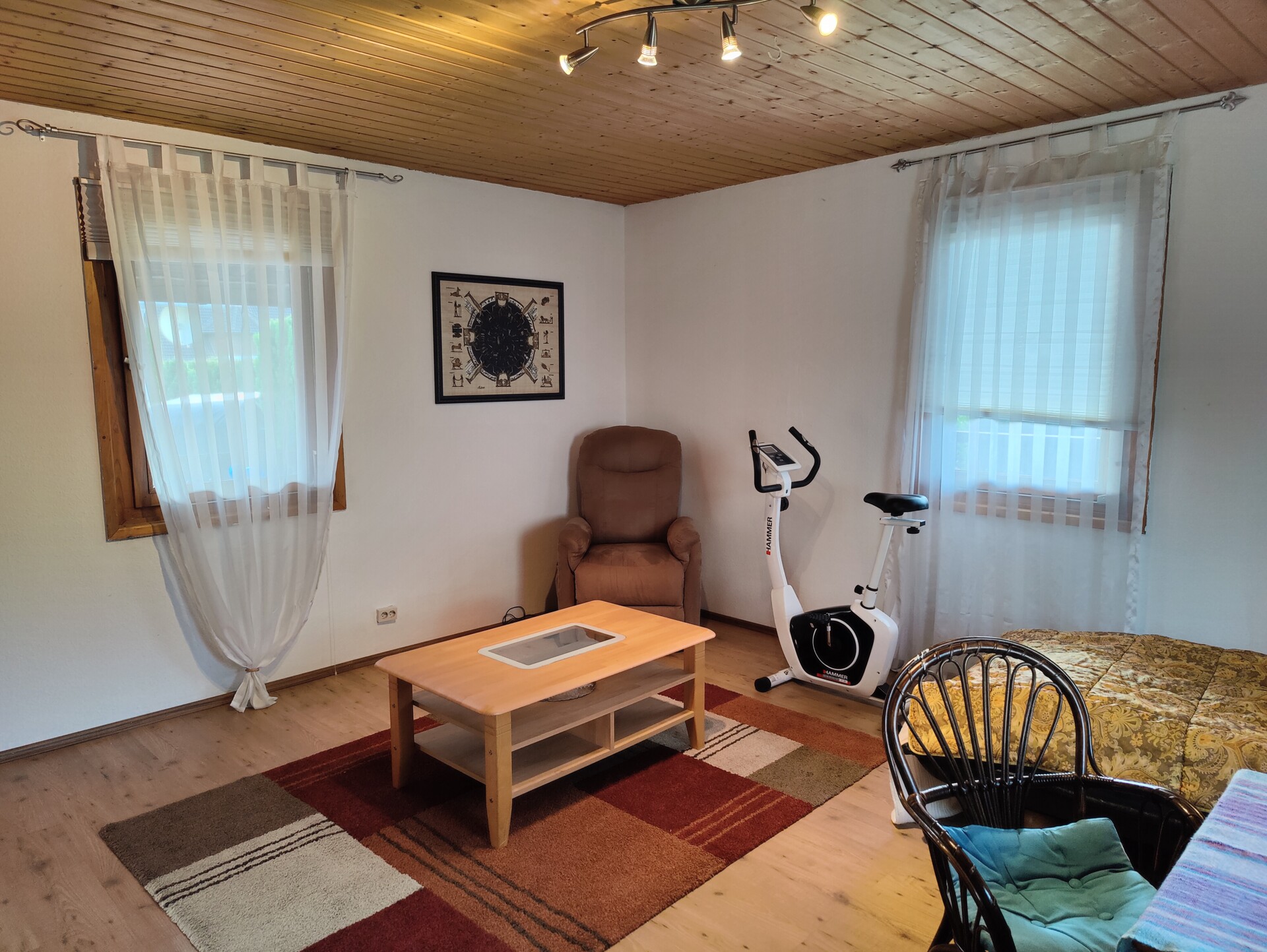 Das Holzhaus steht derzeit leer. Es verfügt über 2 Zimmer und eine große überdachte Terrasse. Bei Bedarf können beide Häuser über einen Durchgang wieder miteinander verbunden werden. Der barrierefrei gestaltete Bungalow kann als Gäste- oder Ferienhaus dienen.