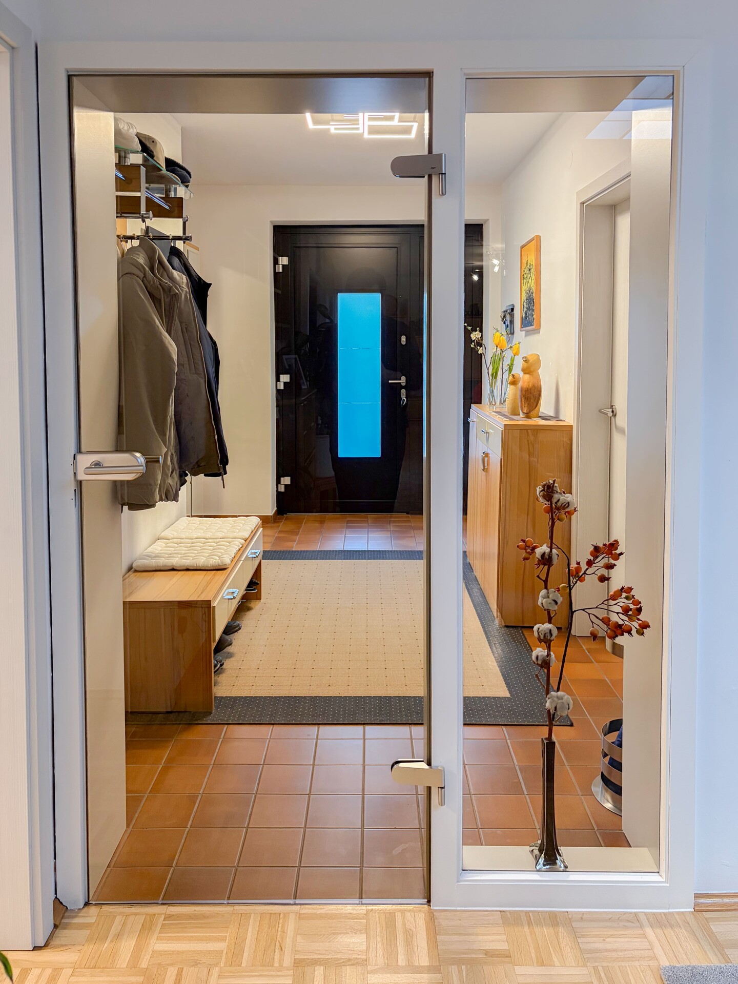– Dreifachverglasung im Wohnbereich, sonst Iso-Verglasung mit Rollläden aus Alu (Fa. Roma);