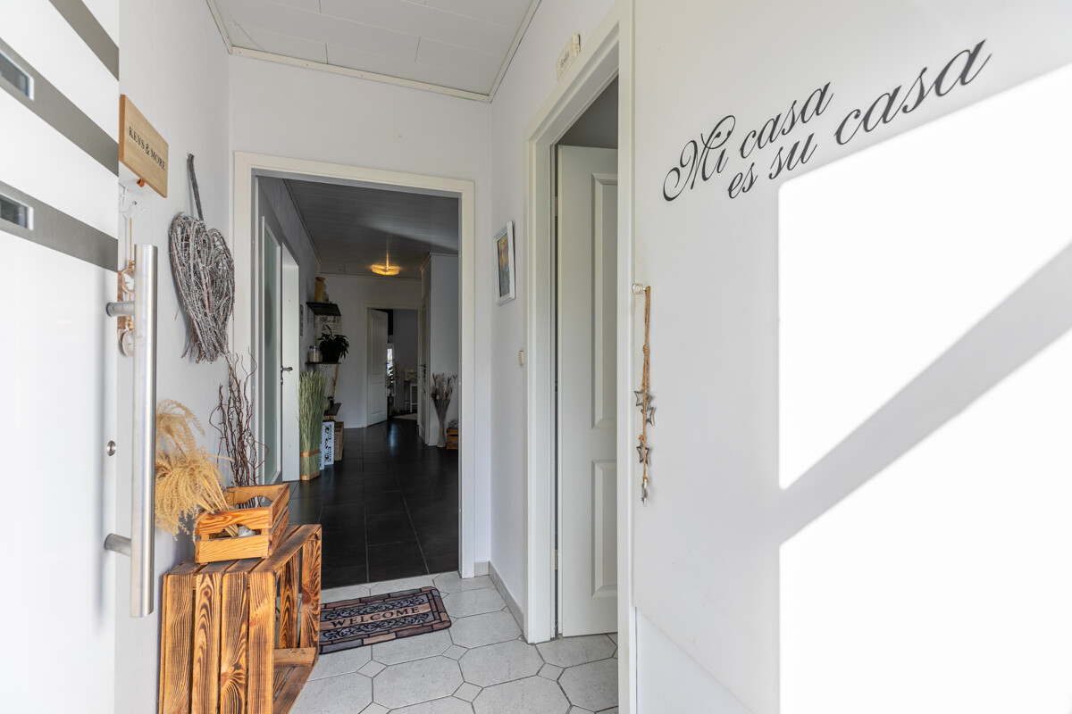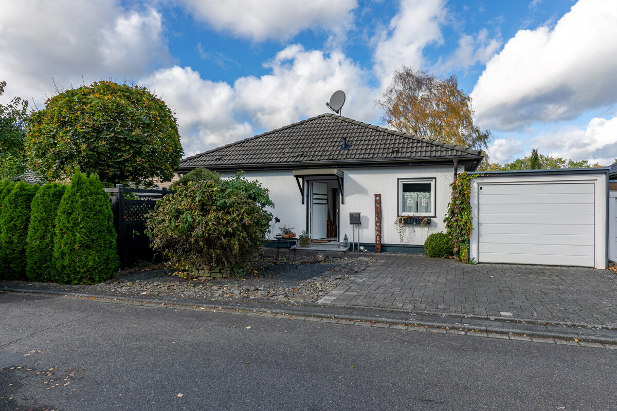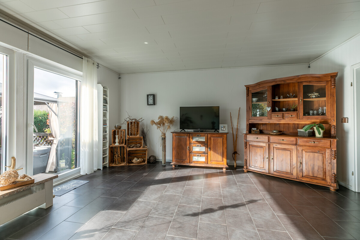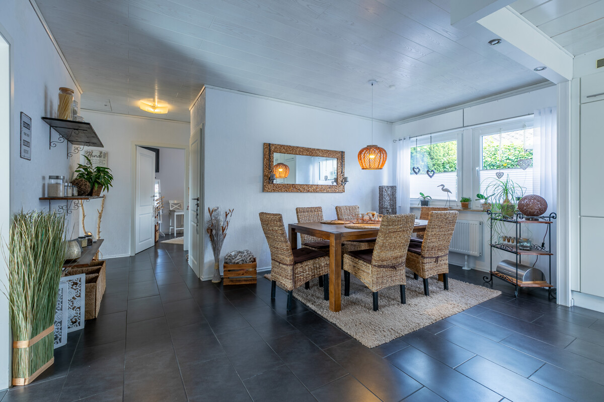 Schon beim Betreten des Hauses empfängt Sie ein freundliches Ambiente. Ein komfortabler Windfang führt in die helle, großzügige Essdiele. Die offene Architektur des Wohn-, Koch- und Essbereichs wird Sie sofort begeistern. In Gedanken lässt sich hier bereits das nächste Familienfest planen. Über die große Fensterfront wird das Wohnzimmer mit Sonne verwöhnt. Gleichzeitig gelangt man von hier aus auf die gemütliche Terrasse und in den hübschen Garten. „Einfach entspannen und genießen“ ist hier das Motto. Die gut ausgestattete Einbauküche hält viele Möglichkeiten zum Experimentieren bereit und ist sogar schon im Kaufpreis enthalten. Gegenüberliegend bieten zwei gut dimensionierte Schlafzimmer schöne Rückzugsmöglichkeiten. Die mittige Anordnung des modernisierten Duschbades mit bodengleicher Dusche ist nicht nur praktisch gewählt, sondern gleichzeitig eine angenehme Trennung zwischen beiden Schlafräumen. Ein modernisiertes Gäste-WC und ein separater Abstellraum ergänzen das Raumangebot auf dieser Ebene perfekt.