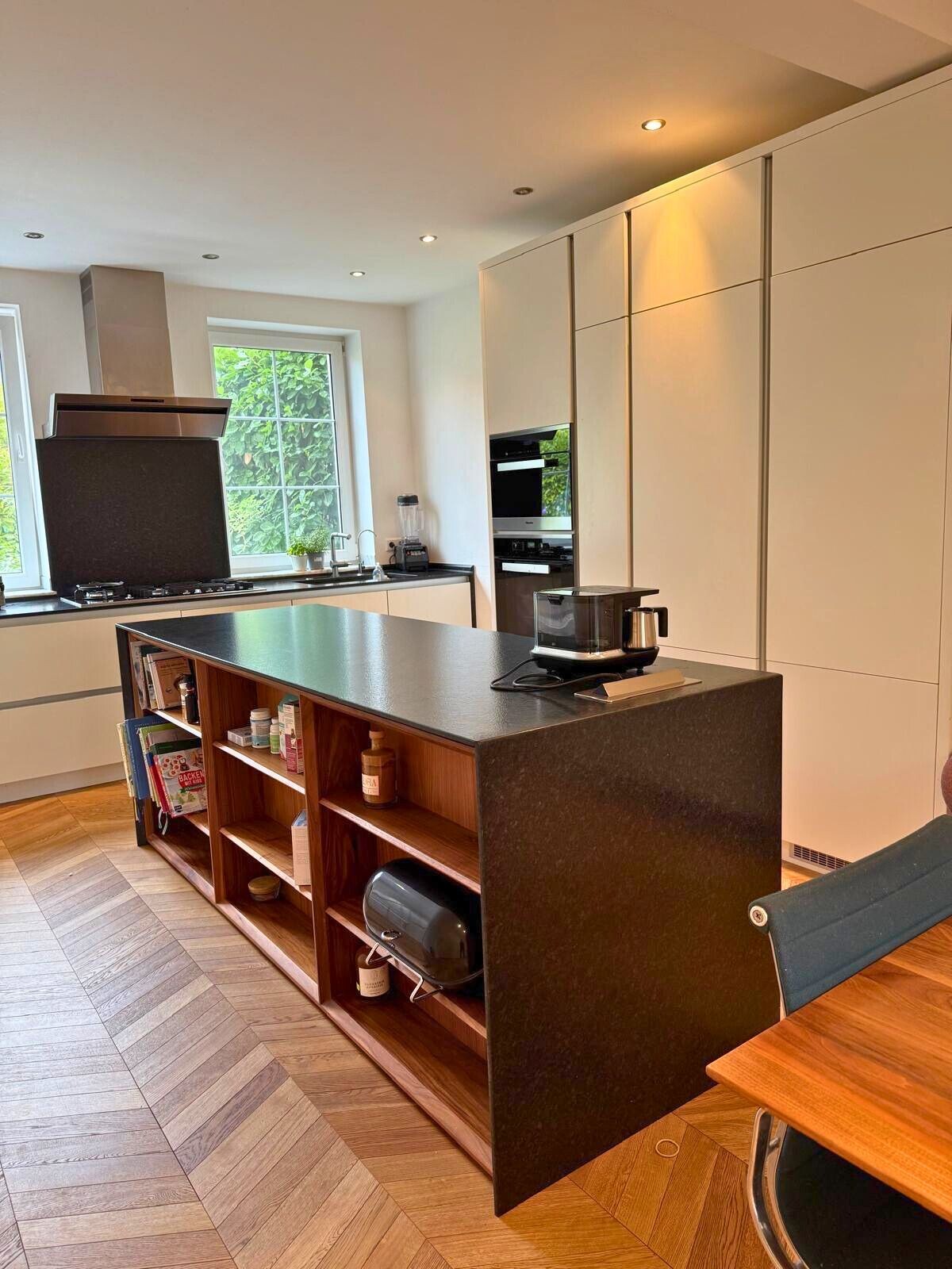 Zentraler Treffpunkt des Hauses ist die ca. 30 m² große Wohnküche mit einer exklusiven Einbauküche und Miele-Geräten – offen, elegant und perfekt für gemeinsames Kochen und Leben. Ein Hauswirtschaftsraum im Erdgeschoss ergänzt das durchdachte Raumangebot sinnvoll.