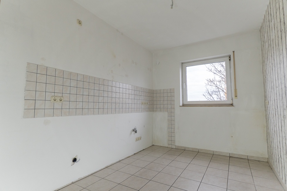 Neben dem Wohnzimmer liegt die Küche mit Platz für eine Küchenzeile und einen kleinen Essbereich. Direkt angrenzend befindet sich das ruhig gelegene Schlafzimmer.