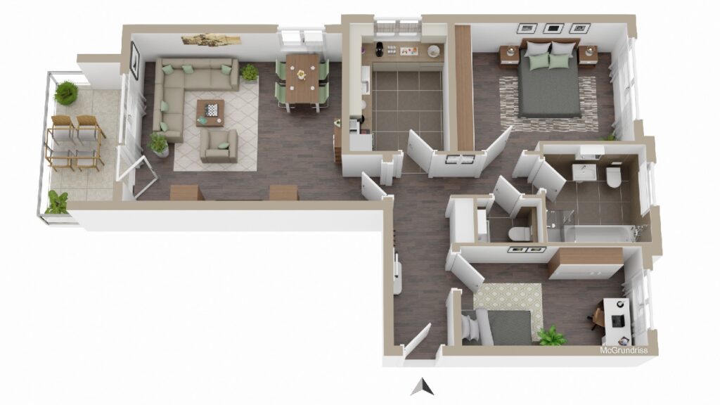 Den Abschluss bilden das Tageslichtbad mit Wanne und Dusche sowie das innenliegende Gäste-WC.