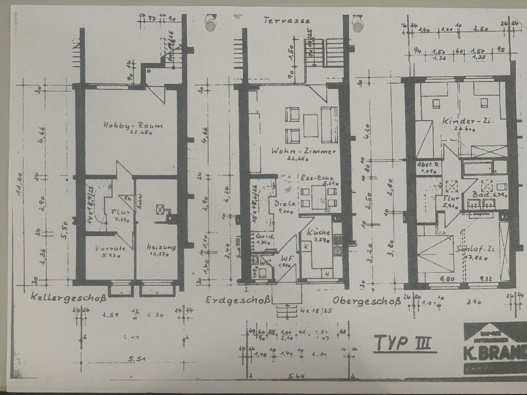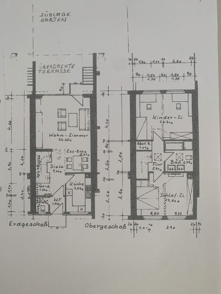 Bauweise: Herkömmlich massiv, einseitig links angebaut. Das Haus ist voll unterkellert. Die lichte Raumhöhe im beträgt ca. 2.30 m. Das Objekt verfügt über zwei Vollgeschosse und ein erneuertes Flachdach.
