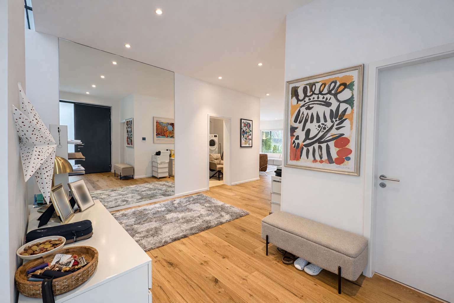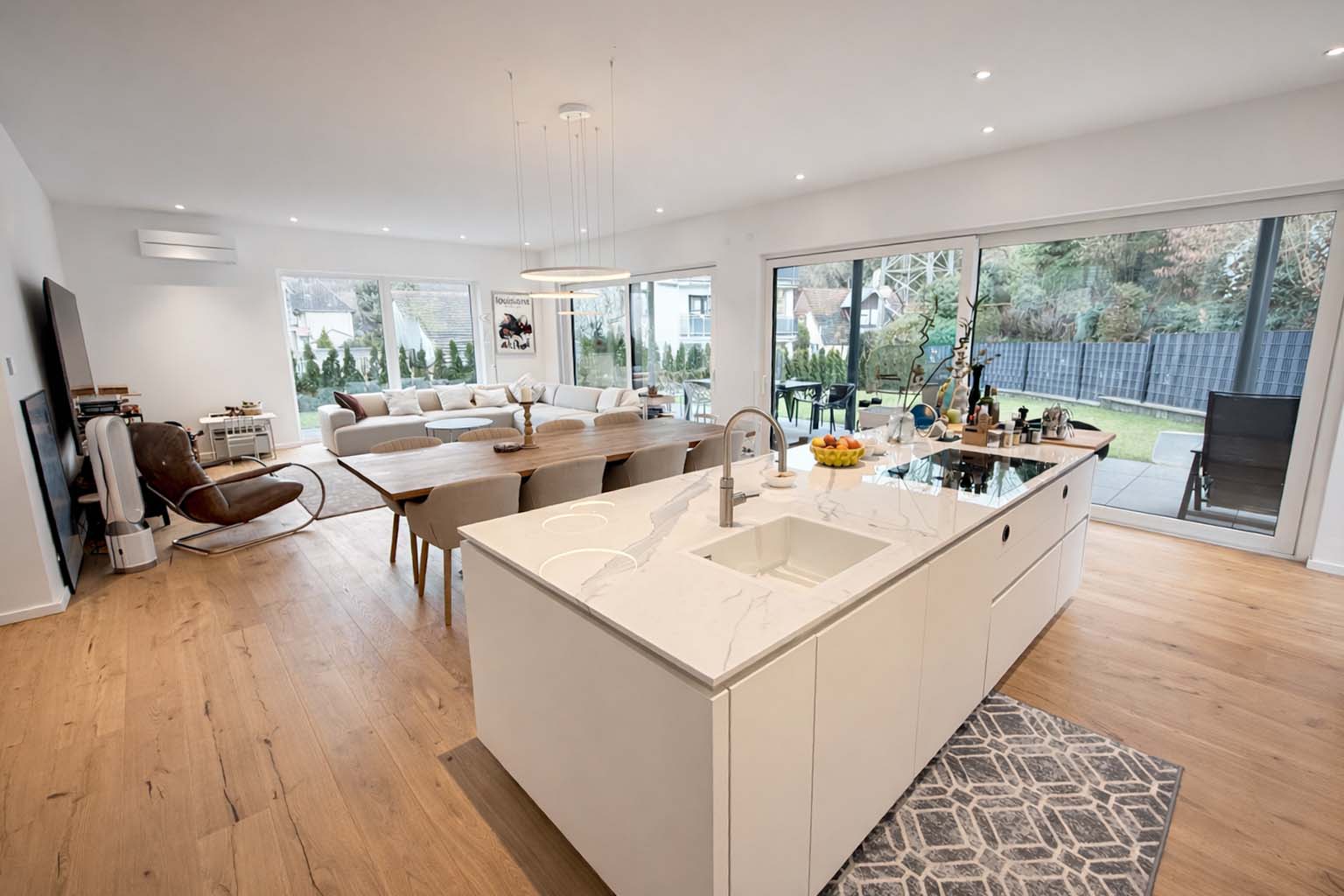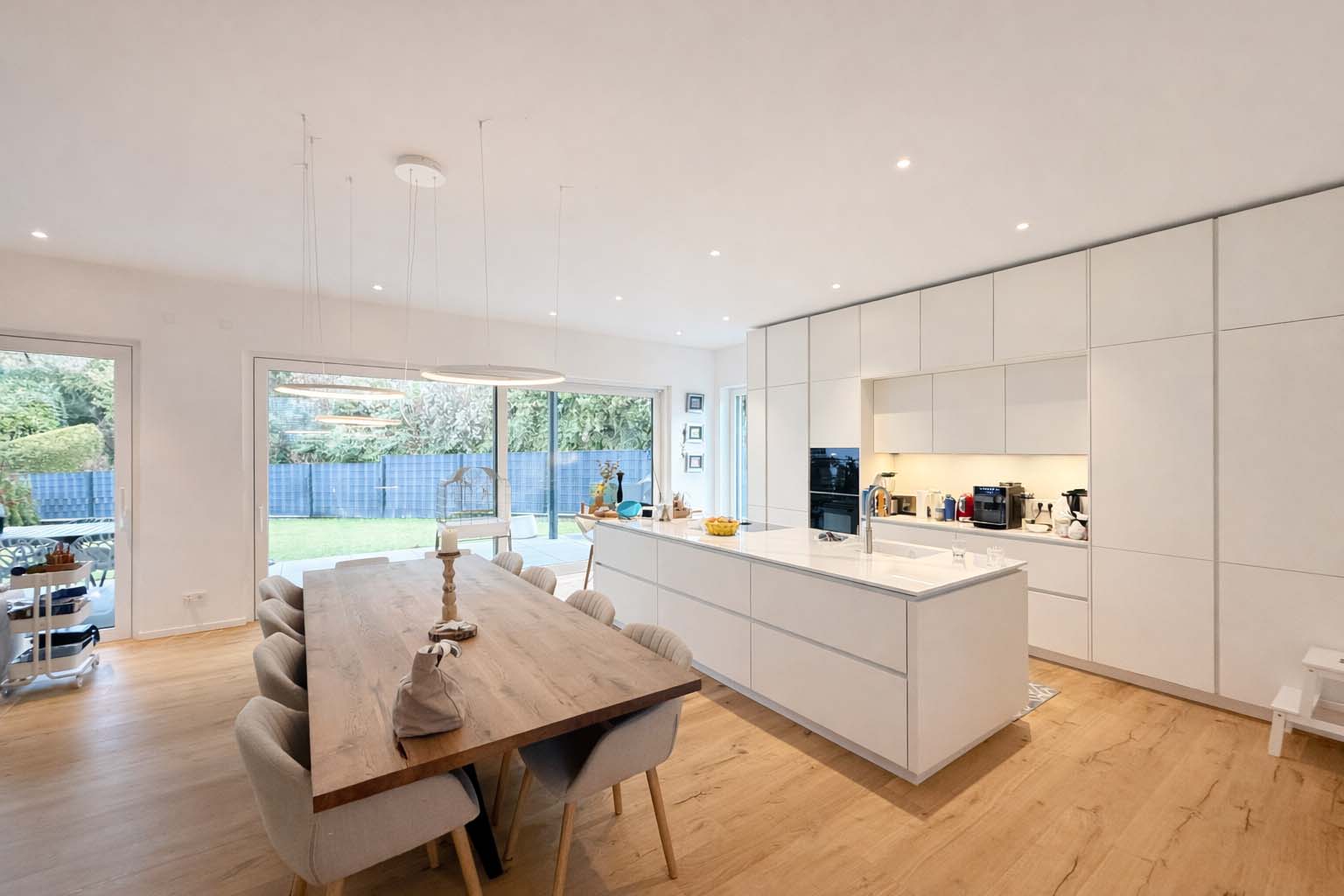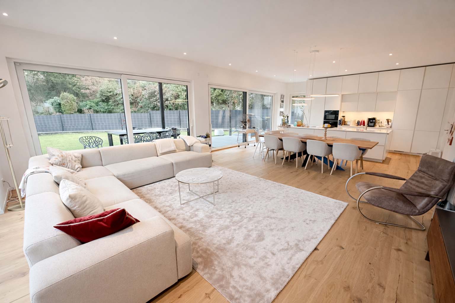 Der offen gestaltete Wohn- und Essbereich mit bodentiefen Fensterflächen schafft ein elegantes und zugleich behagliches Ambiente. Edles Kährs-Parkett, italienische Fiandre-Fliesen in Studio und Nasszellen sowie eine stilvolle Innen- und Außenbeleuchtung von Bega unterstreichen den gehobenen Anspruch. Die maßgefertigte Küche mit Miele-Geräten, Bora-Kochfeld und Quooker-System wird durch eine hochwertige Garderobe und Ankleide von Steeg Wohnconcept ergänzt.