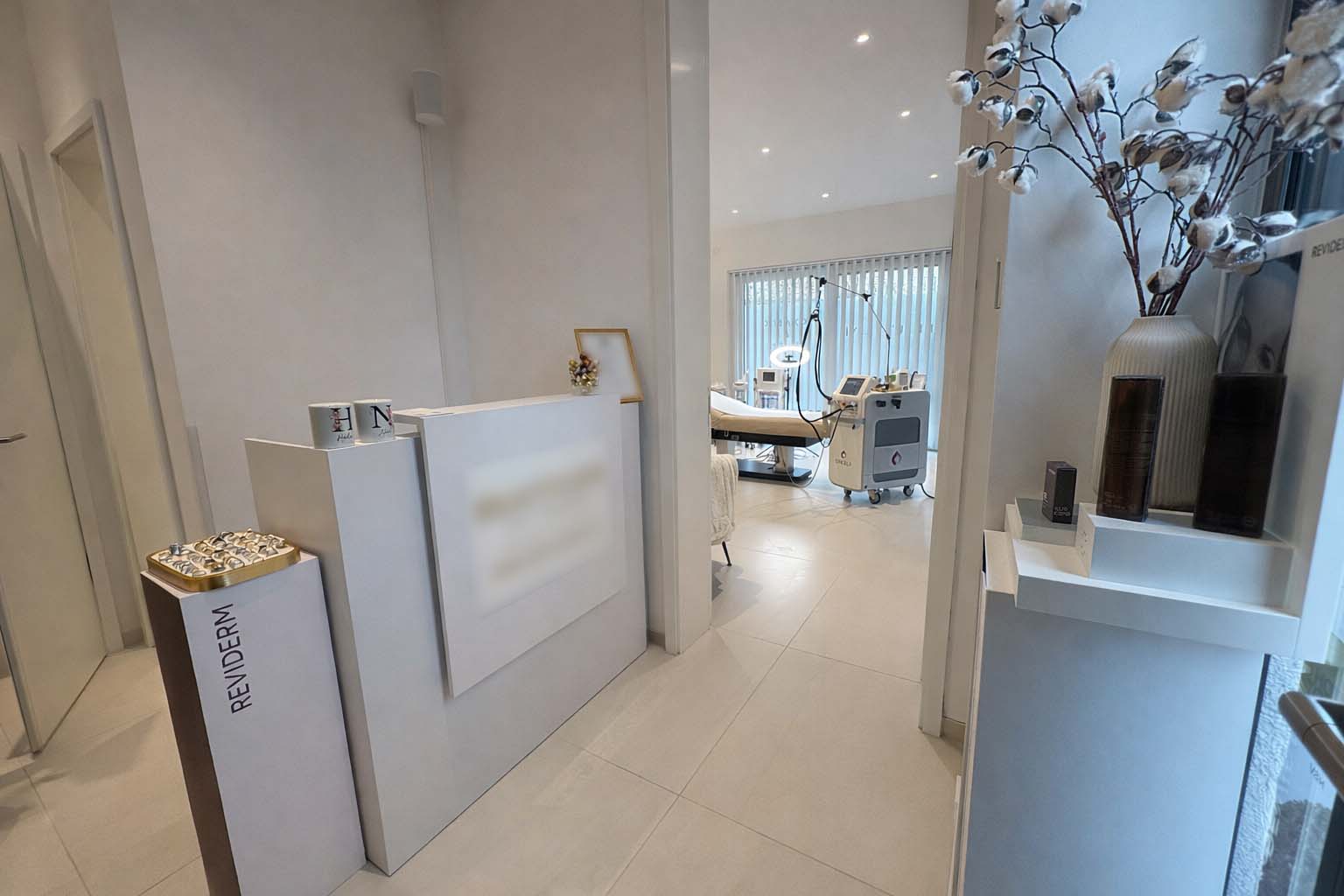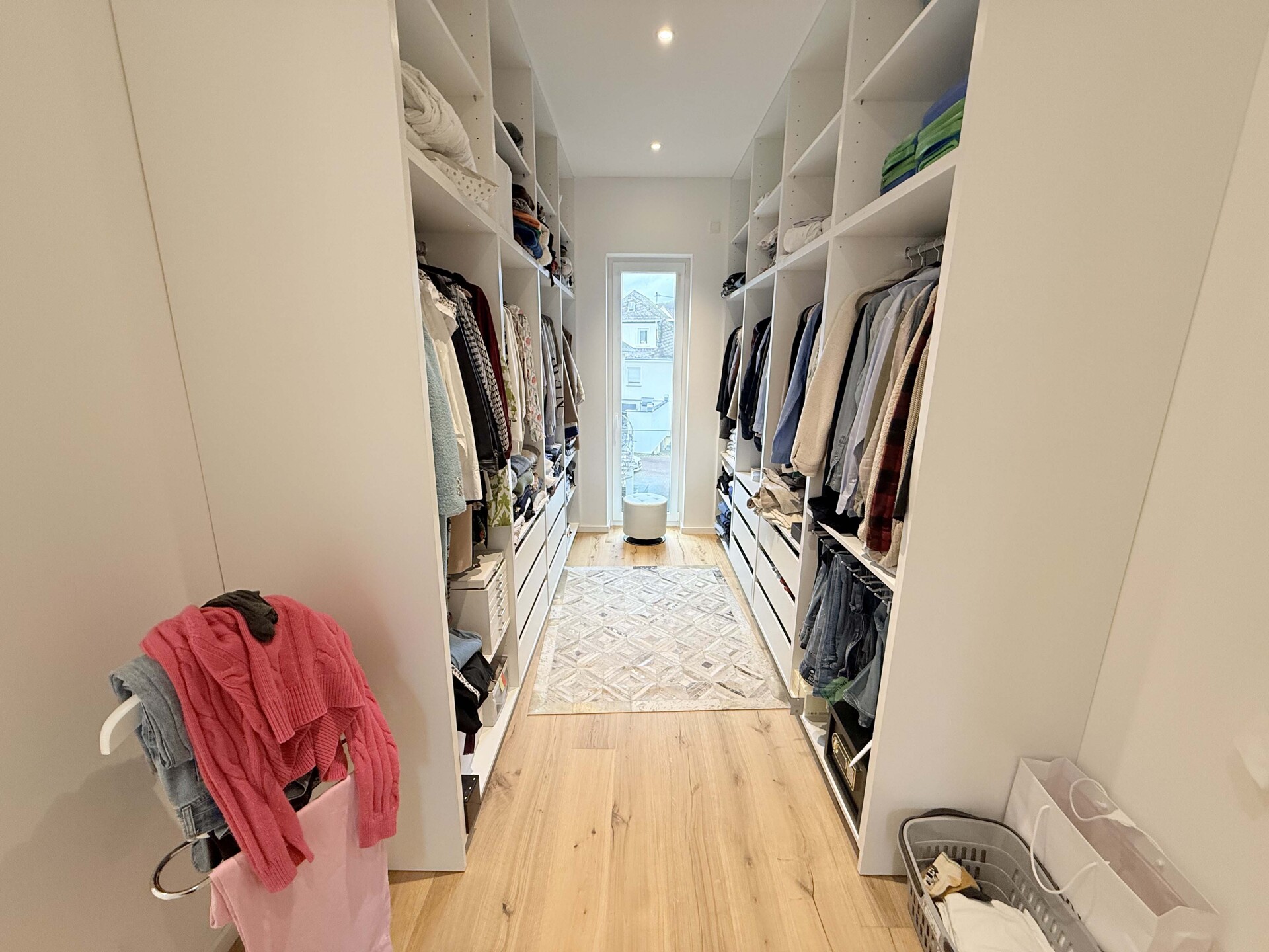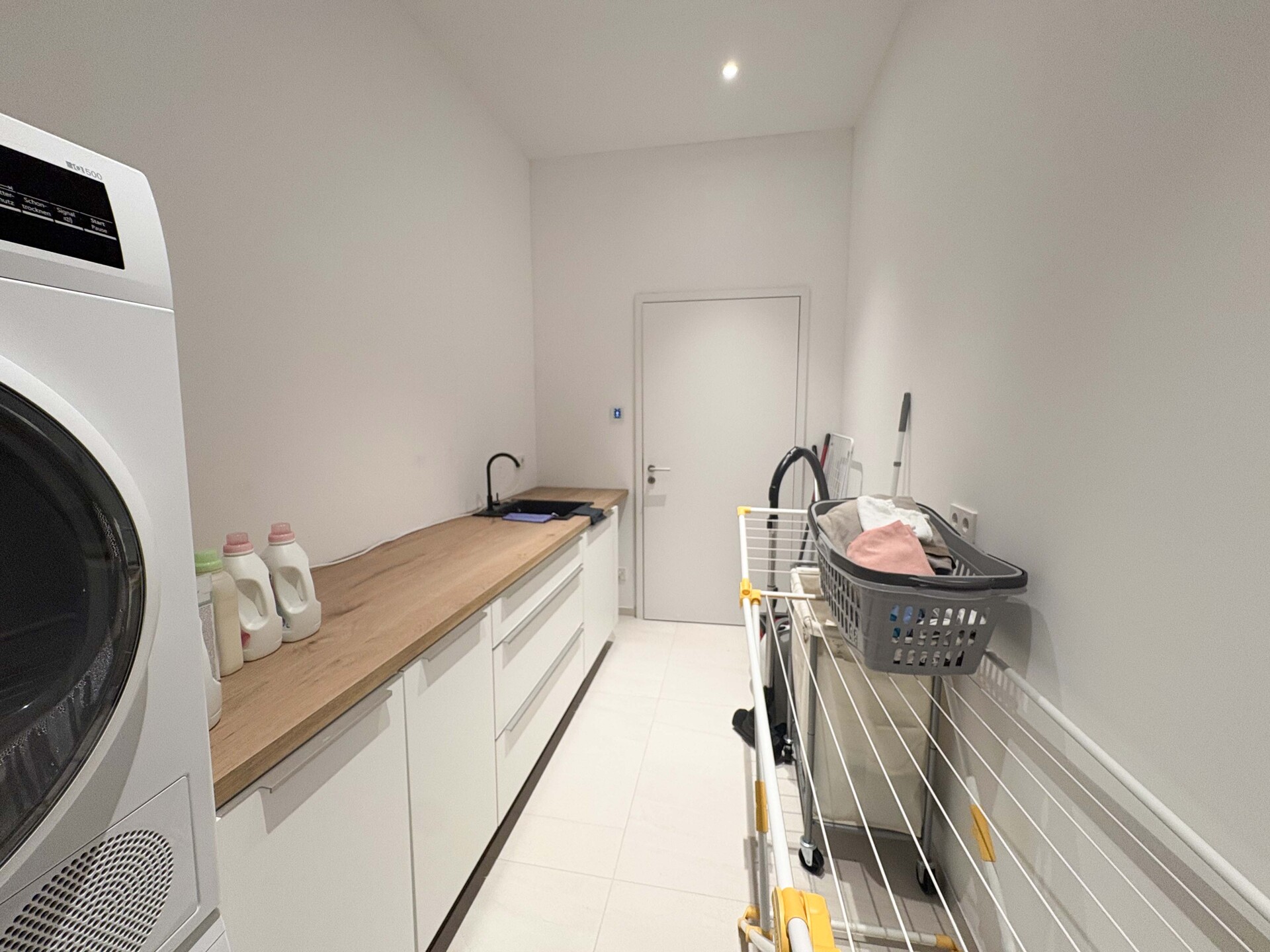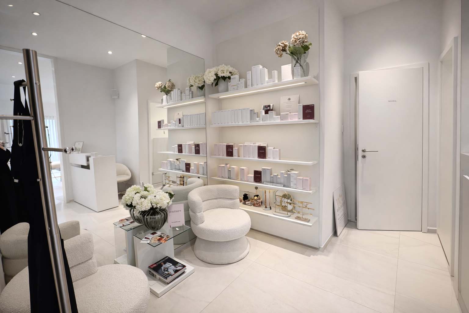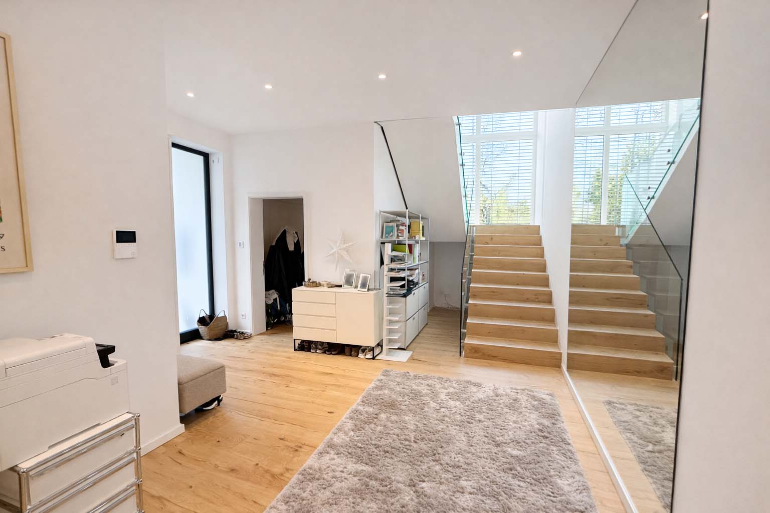 Der offen gestaltete Wohn- und Essbereich mit bodentiefen Fensterflächen schafft ein elegantes und zugleich behagliches Ambiente. Edles Kährs-Parkett, italienische Fiandre-Fliesen in Studio und Nasszellen sowie eine stilvolle Innen- und Außenbeleuchtung von Bega unterstreichen den gehobenen Anspruch. Die maßgefertigte Küche mit Miele-Geräten, Bora-Kochfeld und Quooker-System wird durch eine hochwertige Garderobe und Ankleide von Steeg Wohnconcept ergänzt.