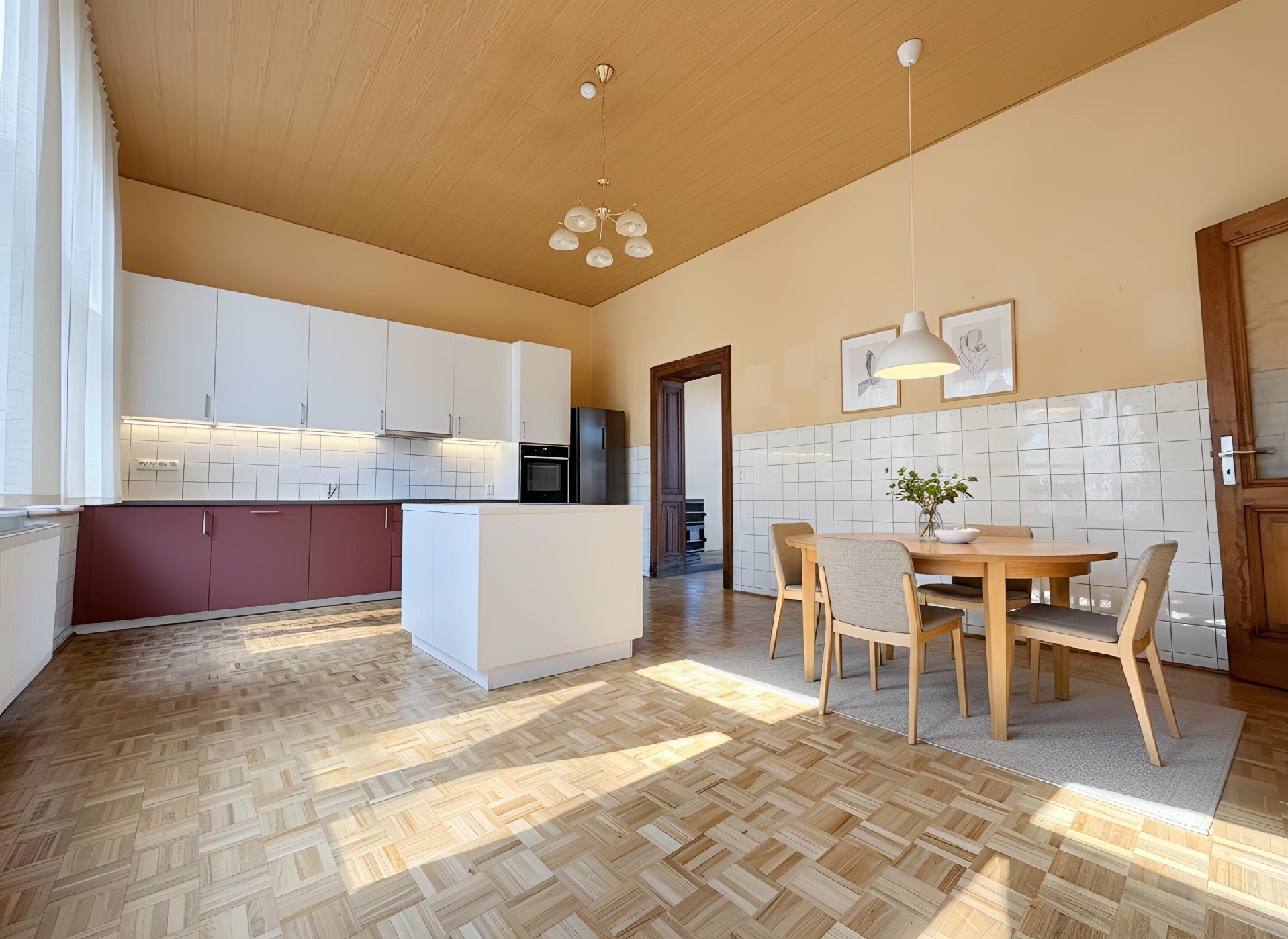 Im 2. Obergeschoss erwartet Sie ein beeindruckend heller Wohnbereich, der dank seiner Weitläufigkeit viel Raum für individuelle Einrichtungsideen lässt. Die angrenzende, geräumige Küche bietet nicht nur viel Arbeitsfläche, sondern auch ausreichend Platz für einen großen Esstisch – perfekt für gesellige Runden. Ein weiteres Zimmer auf dieser Ebene eignet sich ideal als Kinder-, Gäste- oder Arbeitszimmer. Abgerundet wird das Stockwerk durch ein hell gefliestes Duschbad und einen zentralen Flur.