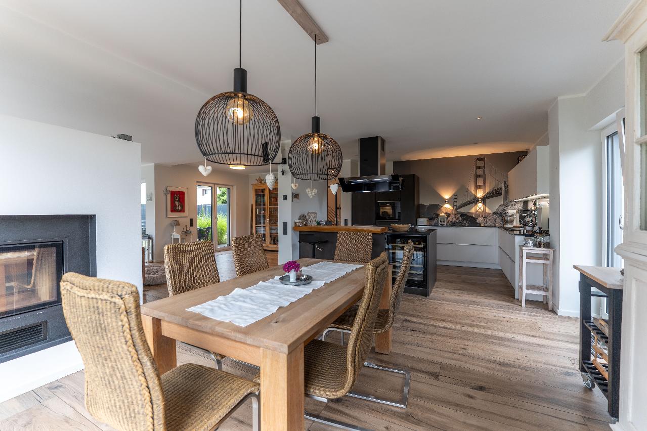 Das Herzstück des Hauses bildet der offene, beeindruckende Wohn- und Essbereich mit einer modernen offenen Küche und Kamin. Große Fenster sorgen für viel Tageslicht und ermöglichen den Zugang zu zwei Terrassen sowie dem sehr gepflegten Garten, der mit einem Gartenhaus zum Entspannen und Verweilen einlädt.