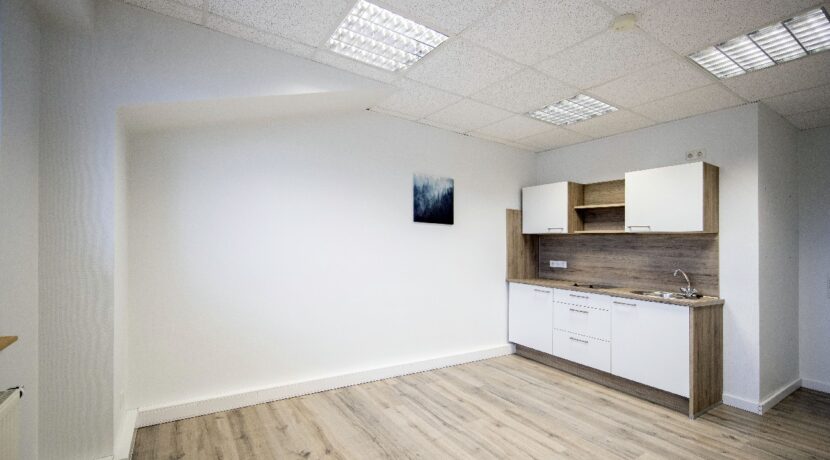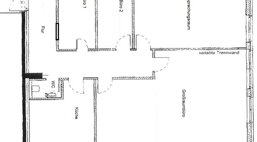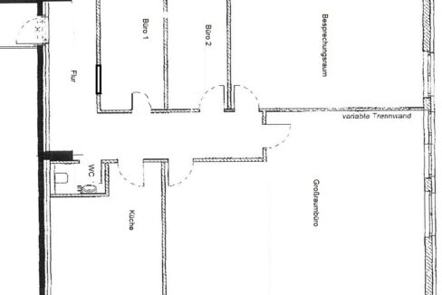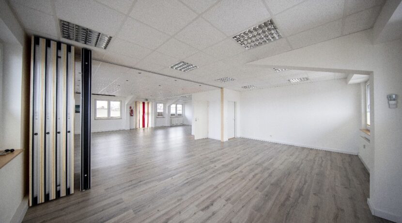 Die Fläche teilt sich auf in ein Großraumbüro das durch eine variable Trennwand noch ein zusätzliches Büro oder ein Besprechungsraum schaffen kann. Außerdem befindet sich auf der ca. 150 m² großen Fläche ein Pausenraum mit Küche, ein WC, ein Flur und 2 weitere Büros.