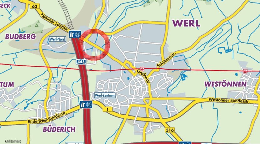 Die Räumlichkeiten befinden sich an der viel befahrenen Hammer Straße, die eine der wichtigsten Ausfallstraßen von Werl darstellt. Bis zur Anschlussstelle zur A445 sind es lediglich ca. 1,2 km