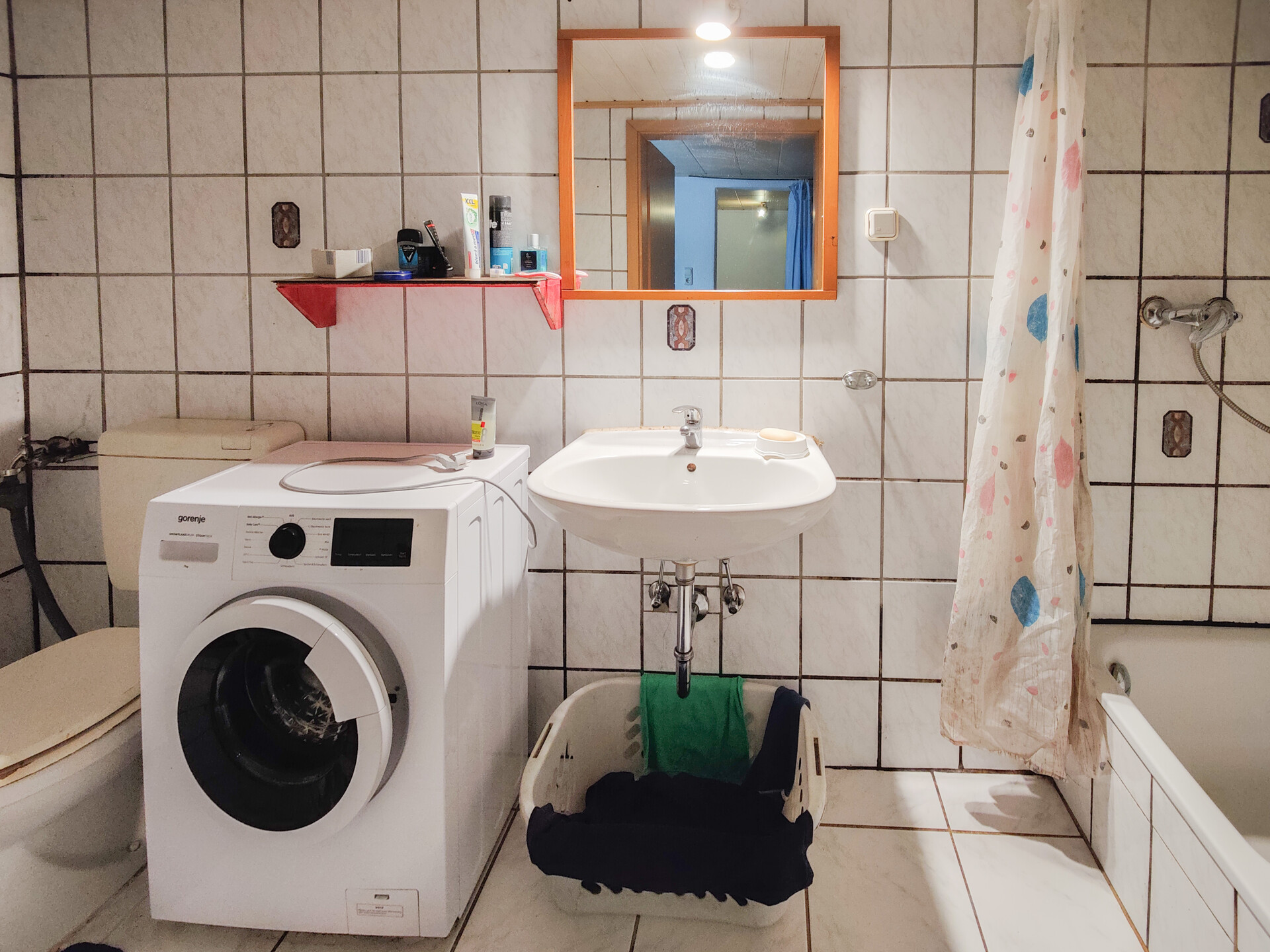 Das Bad verfügt über einen Waschmaschinenanschluss und eine Duschwanne mir Vorhang.