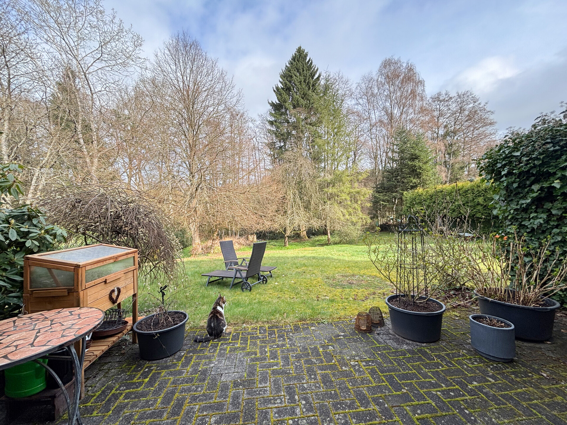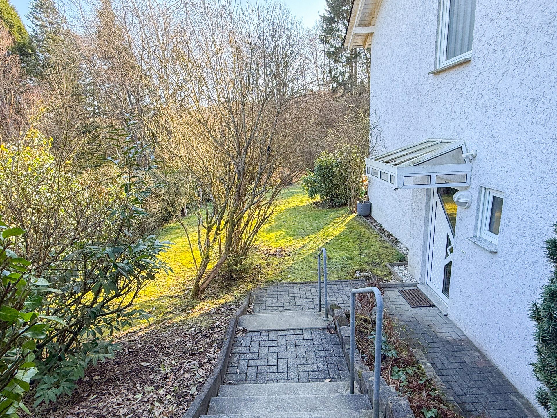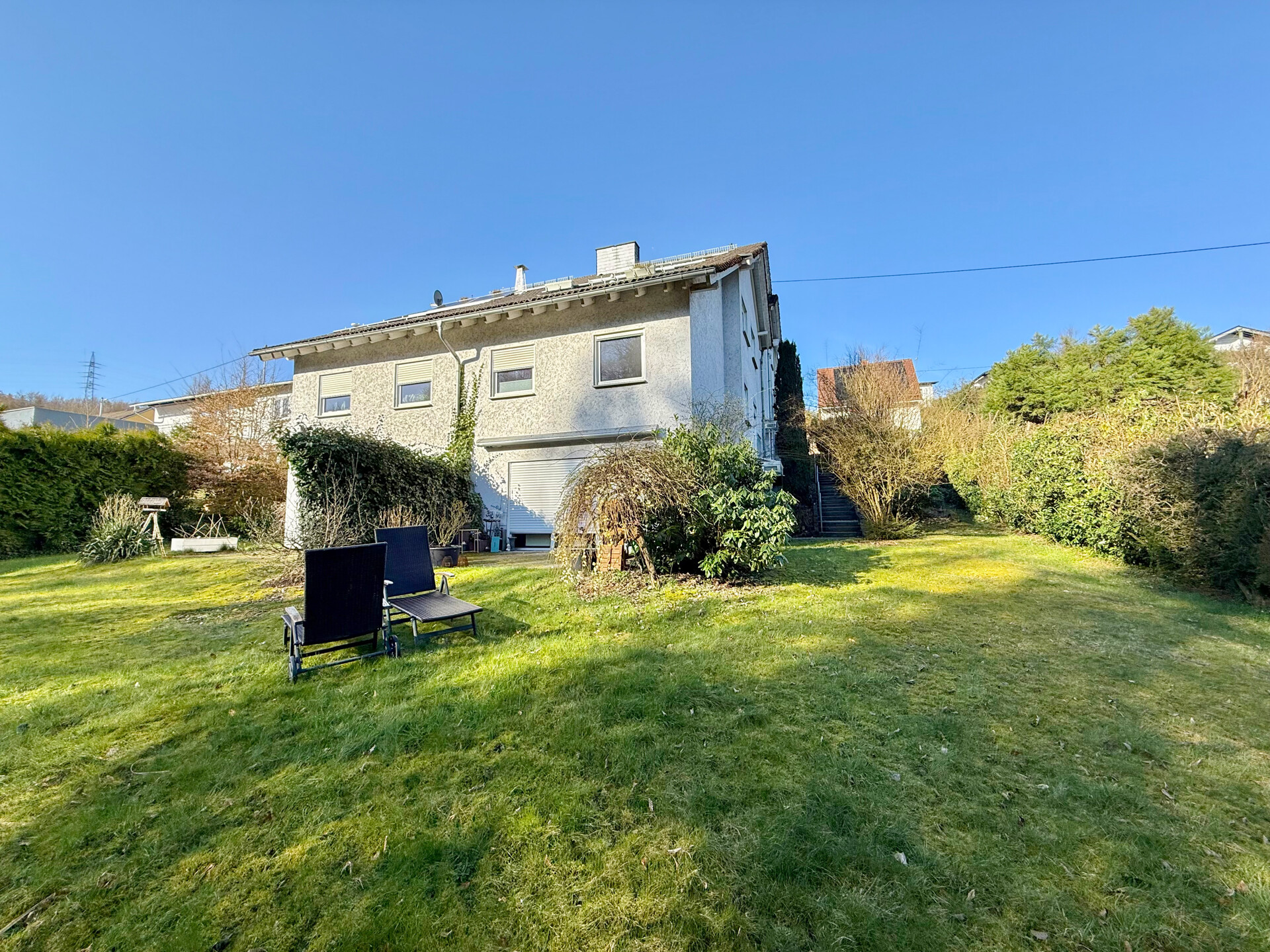 Diese gepflegte 4 Zimmer-Maisonette-Eigentumswohnung (Nr. 1) befindet sich im Untergeschoss eines im Jahr 1994 errichteten Mehrfamilienhauses mit insgesamt sechs Wohneinheiten. Durch die Hanglage bietet die Wohnung einen direkten Zugang vom Wohnzimmer auf die Terrasse und in den Gartenbereich. Die Wohnfläche von ca. 110 m² erstreckt sich über zwei Ebenen und sorgt für eine angenehme Aufteilung der Räume. Auf der unteren Etage befinden sich eine Küche mit Einbauküche, ein Gäste-WC, ein großzügiger Abstell-/HWR sowie ein helles, geräumiges Wohnzimmer mit Zugang zur Terrasse. Von hier aus gelangt man in den gemeinschaftlichen Gartenbereich, der im hinteren Teil an einen kleinen Bachlauf und eine bewaldete Fläche grenzt und somit eine besonders naturnahe Atmosphäre bietet. Über eine Treppe erreicht man die obere Ebene. Hier stehen zwei Schlafzimmer, ein Büro sowie ein modernisiertes Bad zur Verfügung. Ein eigener Stellplatz im oberen Grundstücksbereich gehört ebenfalls zur Wohnung. Die Einheit ist aktuell vermietet und erzielt eine monatliche Kaltmiete von 950 €. Es besteht ein Vertrag mit einer Hausverwaltung, die sich um die Abrechnungen der WEG kümmert. Zwei Räume werden zeitnah noch renoviert (Tapezieren + Streichen).
