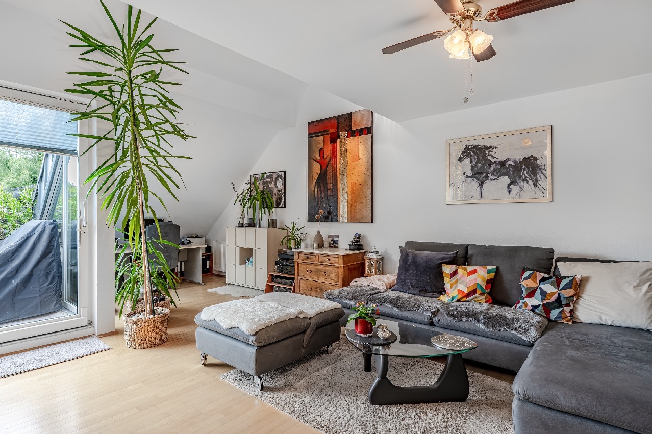 Eine filigrane Wendeltreppe führt ins Galeriegeschoss. Hier beeindruckt besonders der offene Galeriebereich mit Blick in das darunterliegende Geschoss – die großzügige Deckenhöhe und der Lichteinfall schaffen ein luftiges, beinahe loftartiges Wohngefühl. Das Galeriegeschoss beherbergt ein geräumiges Elternschlafzimmer mit praktischen Einbauschränken sowie ein Tageslichtbad mit Dusche und Eckbadewanne. Ein weiterer, ursprünglich als Kinder- oder Gästezimmer geplanter Raum wird als private Sauna und Ruhezone genutzt. Ein Rückbau zur Nutzung als Büro oder Kinderzimmer ist auf Wunsch ohne großen Aufwand möglich. Von hier aus gelangen Sie direkt auf den zweiten, uneinsehbaren Balkon mit weitem Blick ins Grüne. Ein Rückzugsort mit echter Wellness-Qualität. Ein kleiner Abstellraum in der Dachschräge komplettiert die Wohneinheit.