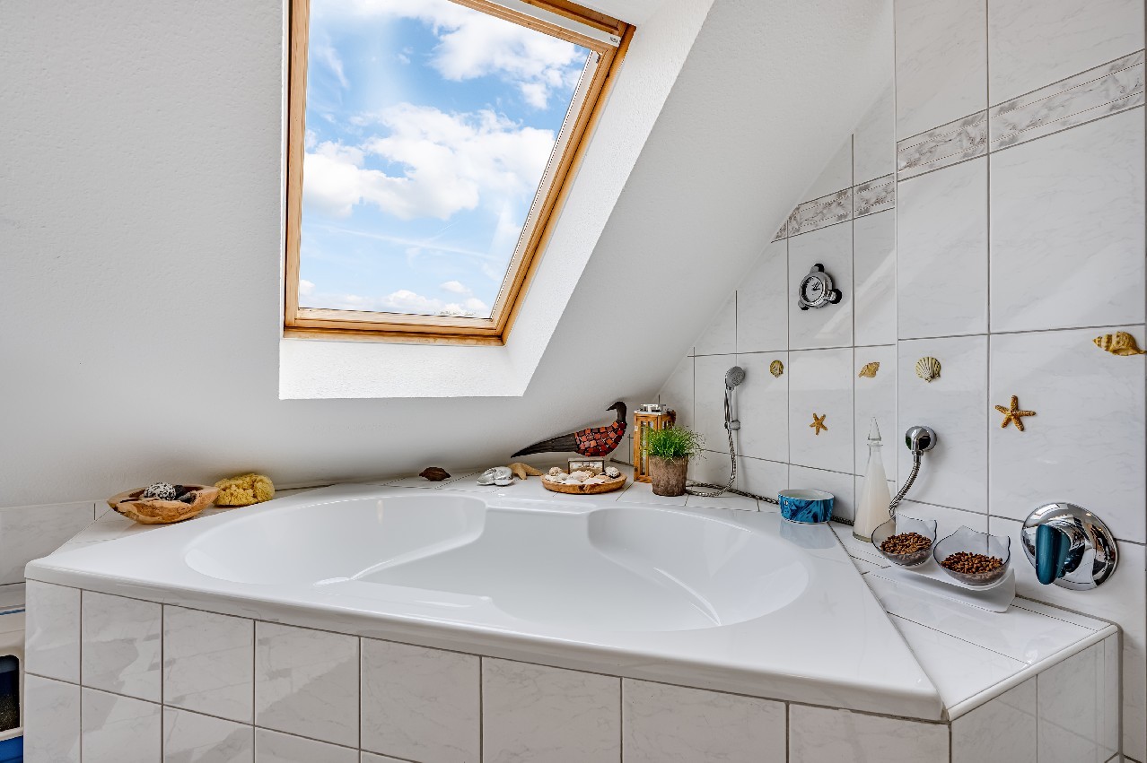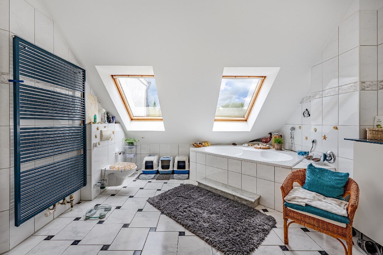 • Badausstattung: Dusche, Badewanne, Fenster im Badezimmer